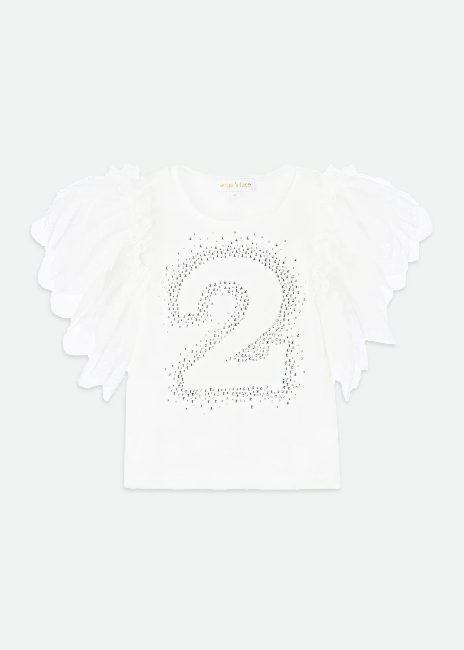 Beautiful snowdrop white top with soft petal tulle sleeves made from a super soft cotton blend. Featuring gorgeous diamante hot stone number 2 design on the front so any birthday girl can stand out.