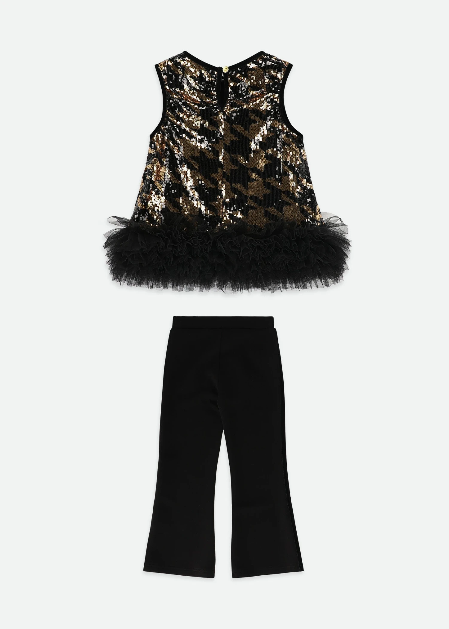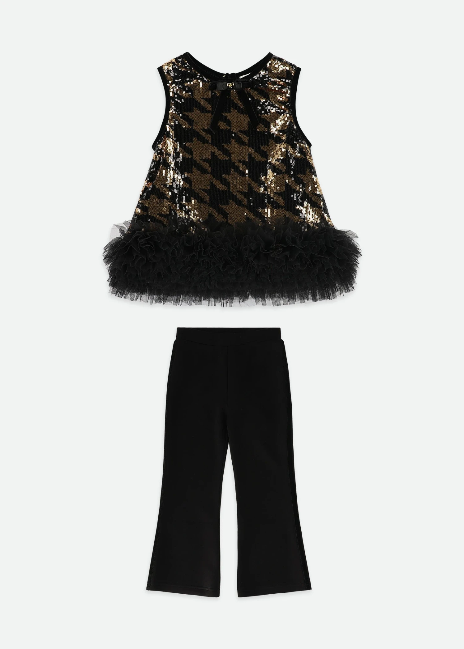 Fun and fabulous houndstooth sequin set for girls. The sleeveless top is covered in black and gold sequins for a sparkling statement look, finished with a dramatic tulle hem and a velvet bow with the Angel’s Face signature gold heart charm. Fully lined in soft cotton blend for comfort. The matching black flared trousers are made in a soft, stretchy fabric for easy movement and style.
