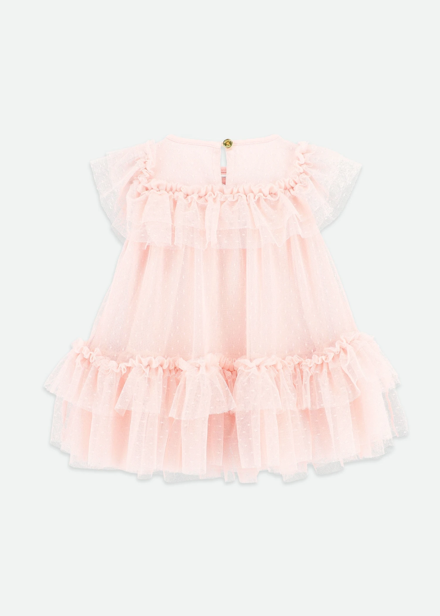 Elegant pink dot tulle dress with pretty yoke that is made up of pin tucks and heart lace. There is a ruffle detail around the yoke that falls over the shoulders to form the cap sleeve. Ruffle neck with a gross grain bow. It fastens at the back with a gold logo button. Lined in a soft cotton blend.