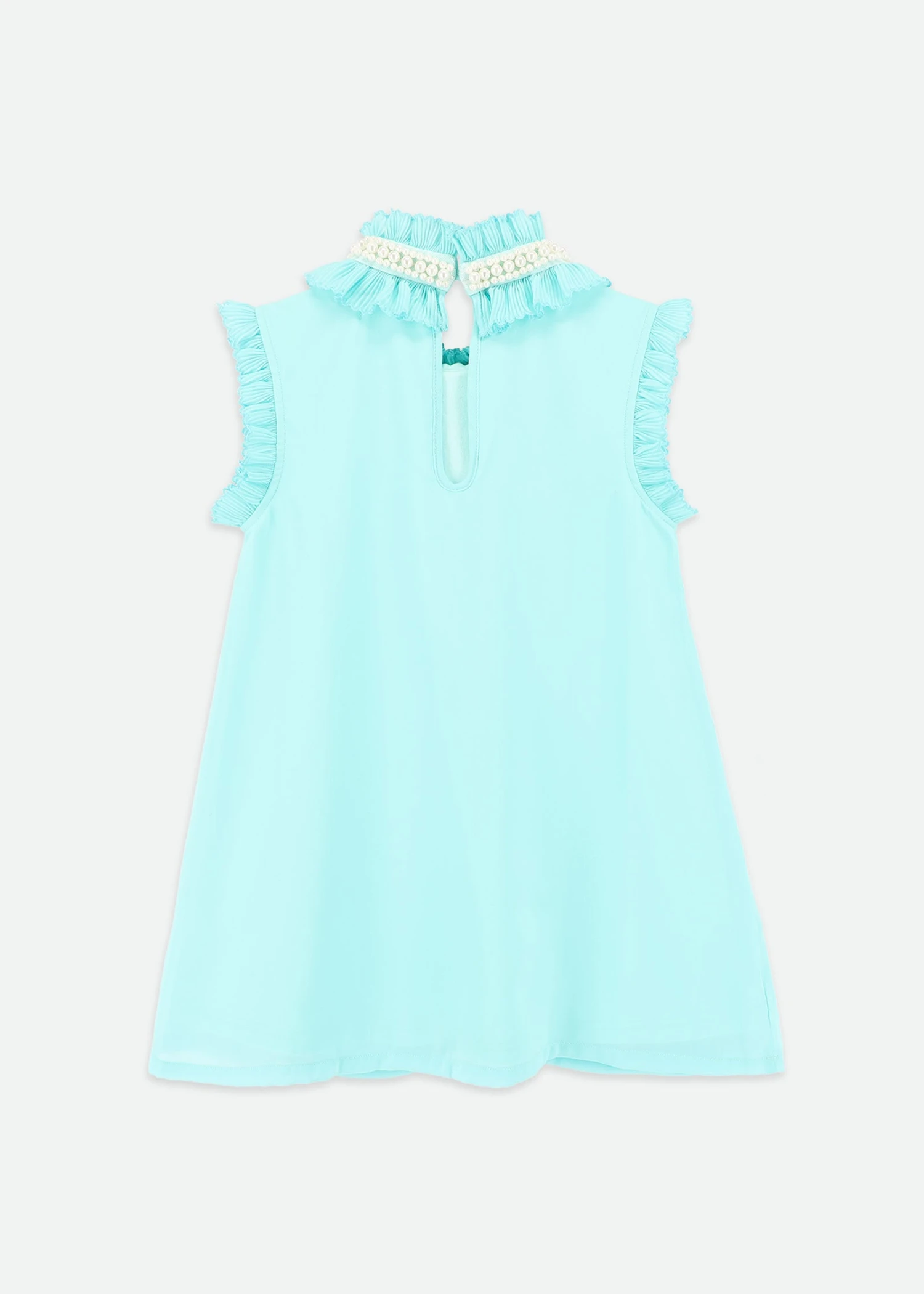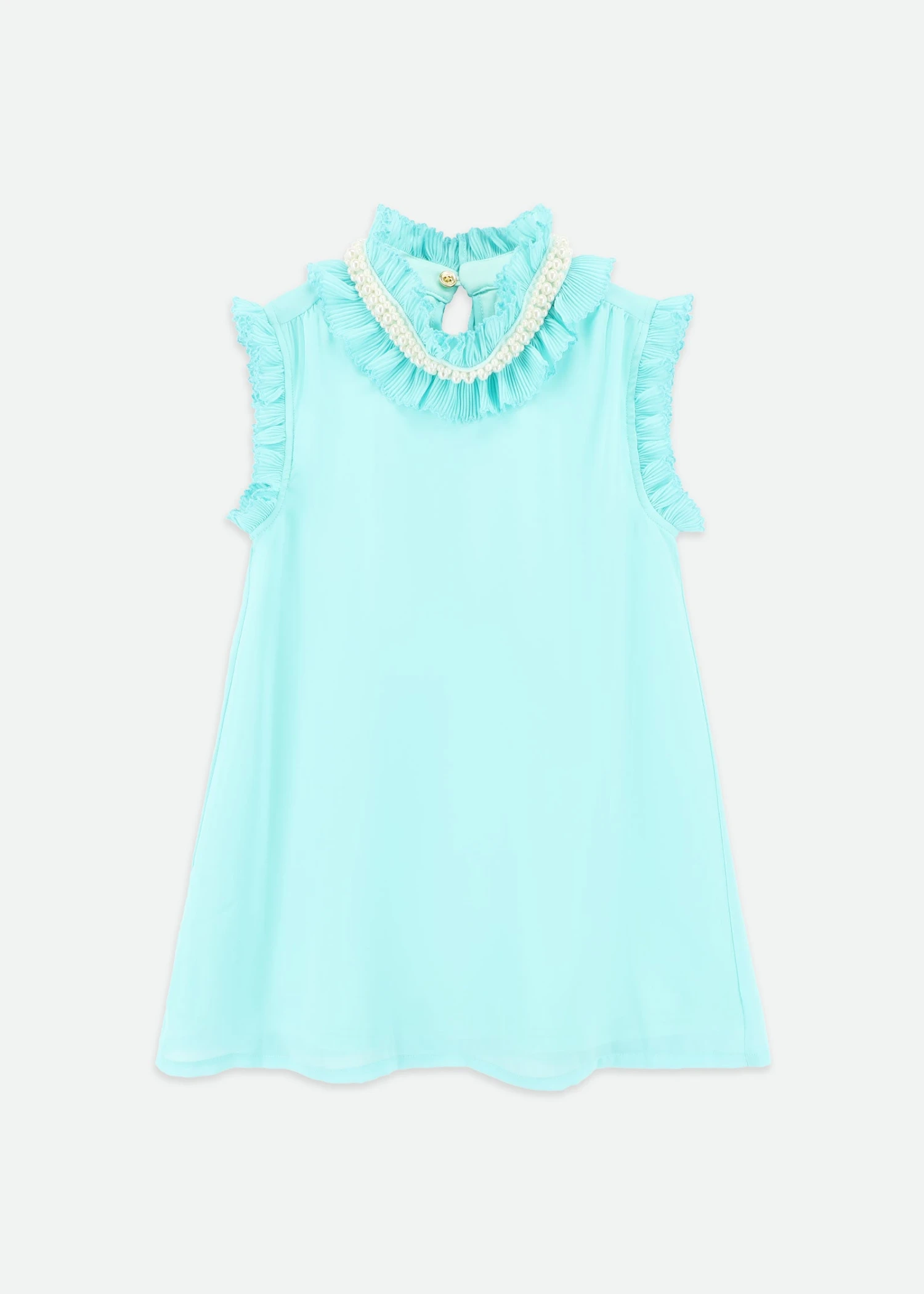 Dazzling pleated tulle and pearl dress in aqua. This dress features a pleated tulle collar with pearls and lovely tulle sleeves. Fastens at the back with a gold logo button.
