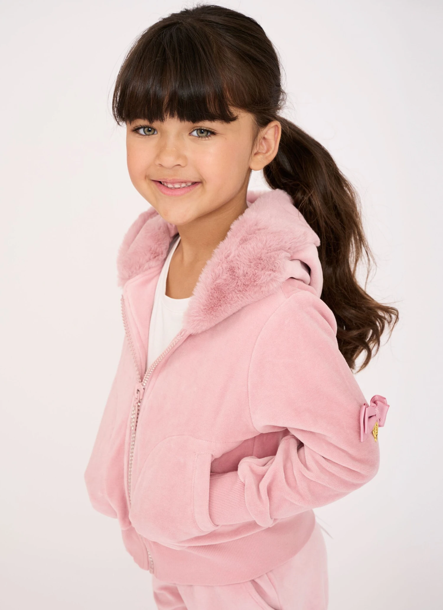 Aspen zip up hoodie is soft and cosy making a perfect edition to your loungewear sets. Made from a comfortable velour with faux rabbit fur edging the lined hood. Design features include; pockets for those little treasures, a fabulous crystal zip and our signature bow and gold heart charm adorning the sleeve.