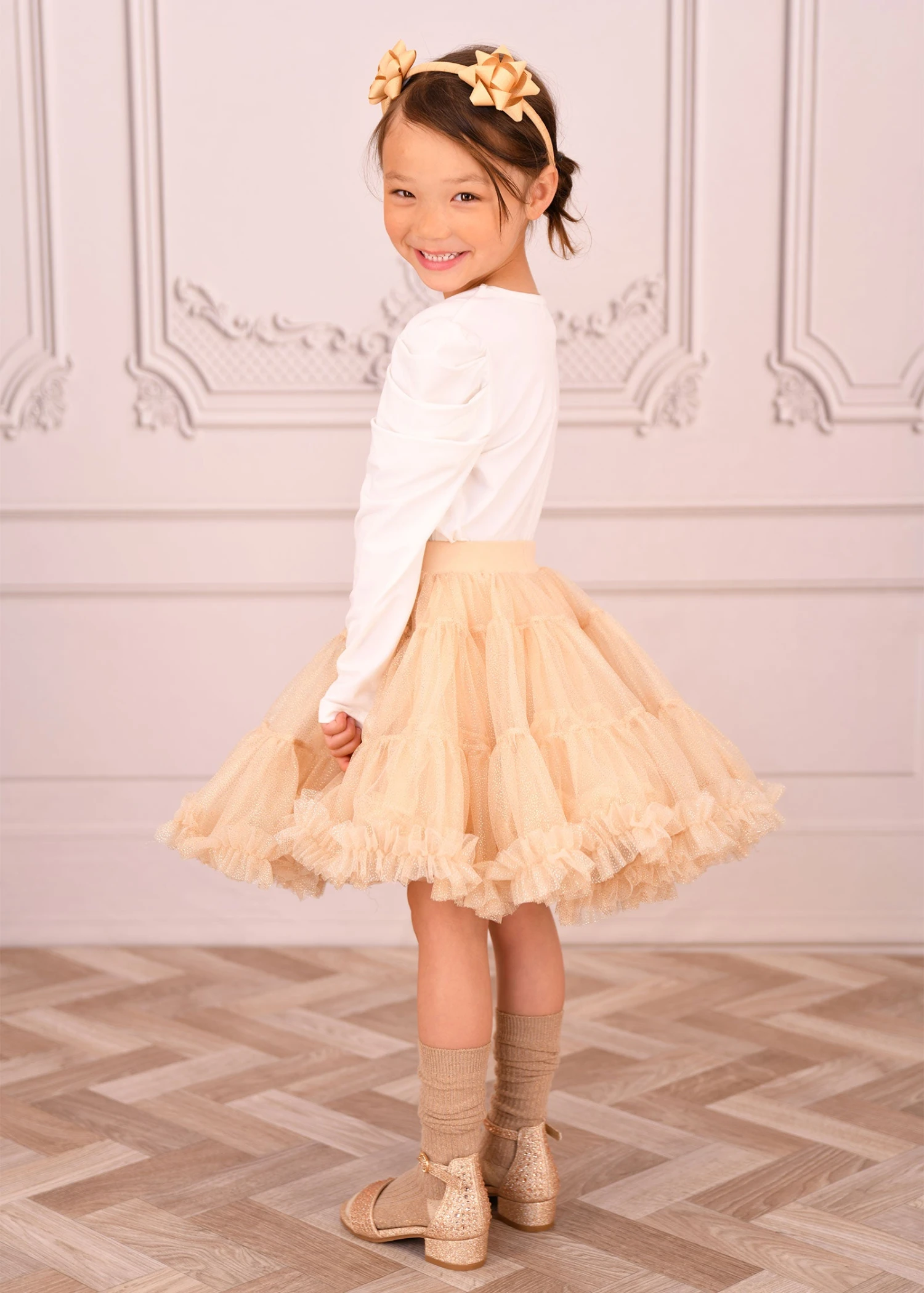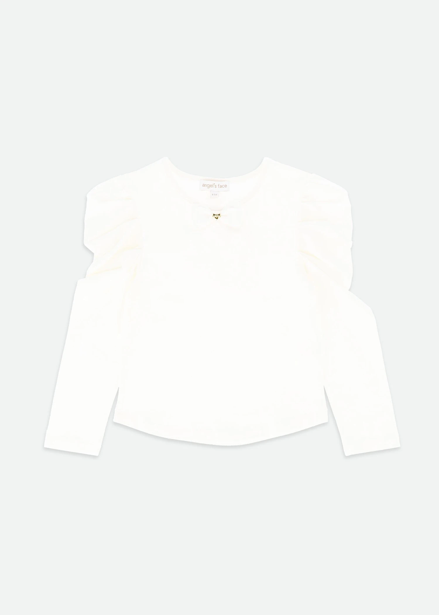 Our soft snowdrop cotton jersey, girls long-sleeved T-shirts are the perfect wardrobe staple. Made with an element of stretch to keep it in shape, this fitted top has pretty ruched detailing on the sleeves and our signature bow and gold heart stie at the neck.