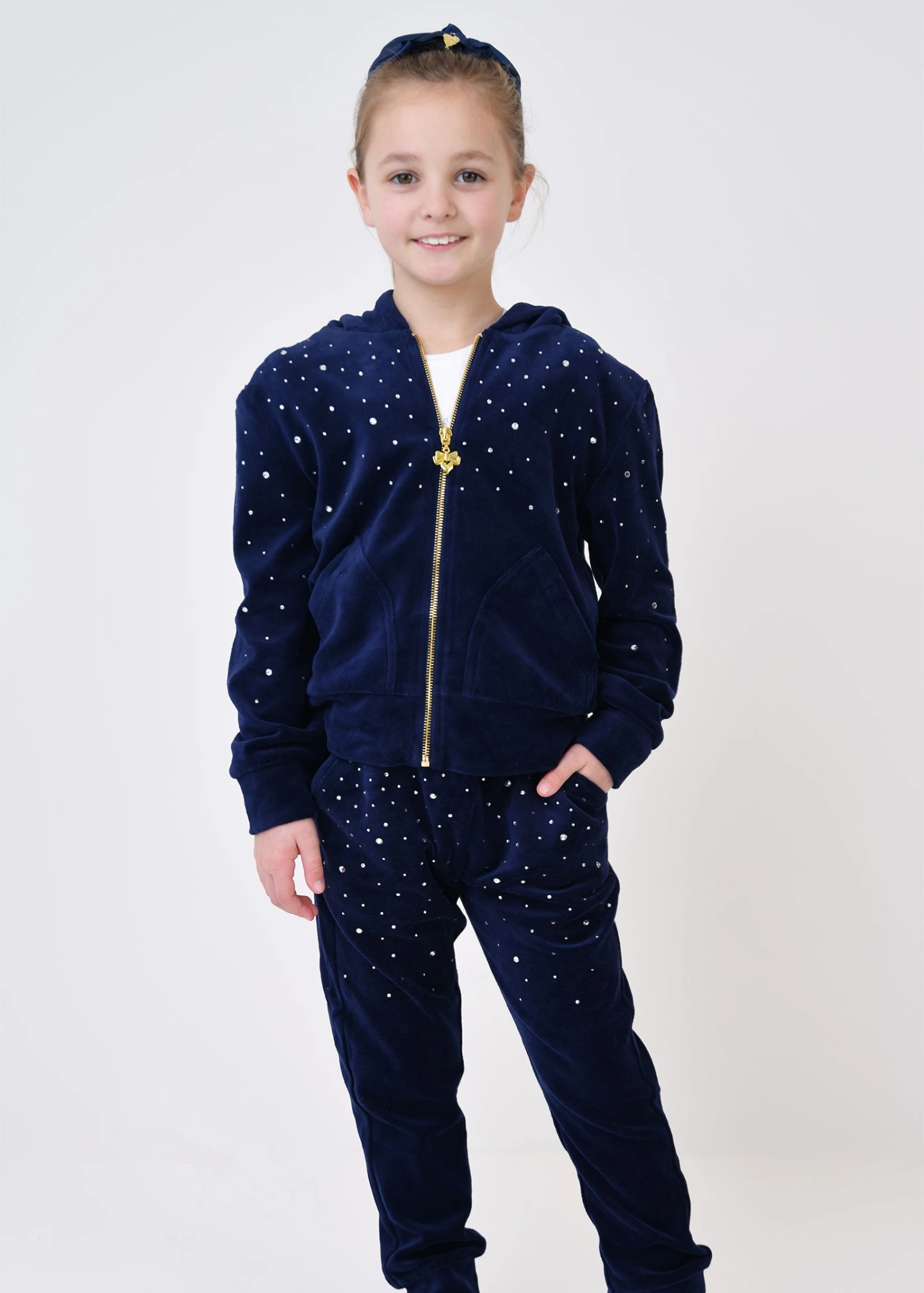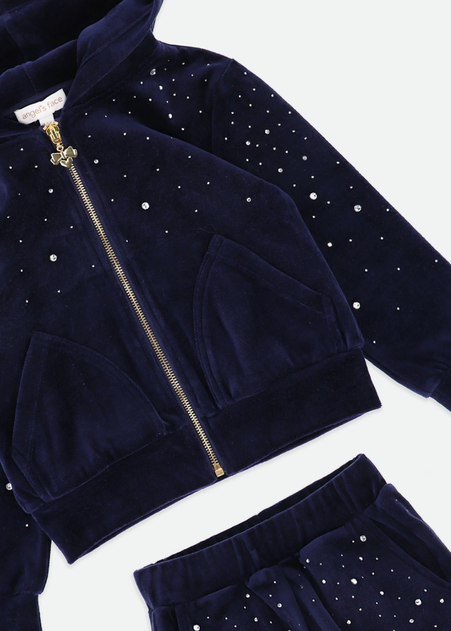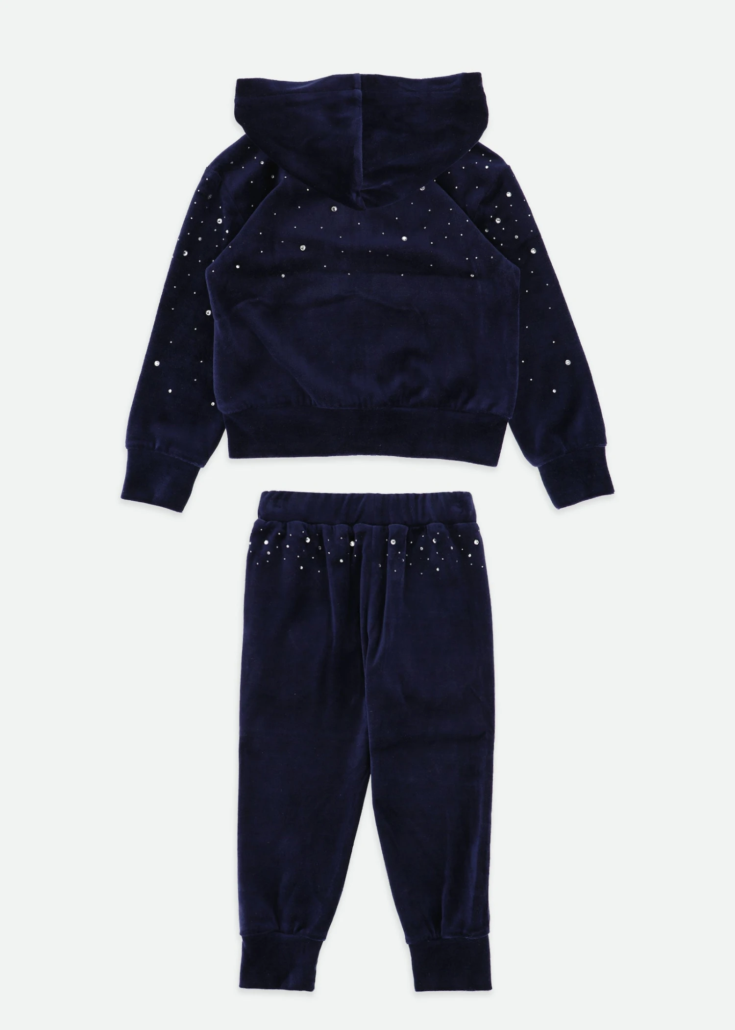 Luxuriously soft velour tracksuit in Navy Blue. The set is embellished with crystals and the hoodie fastens at the front with our iconic gold zip and heart puller. The Joggers have a soft stretch waistband and cuffs.