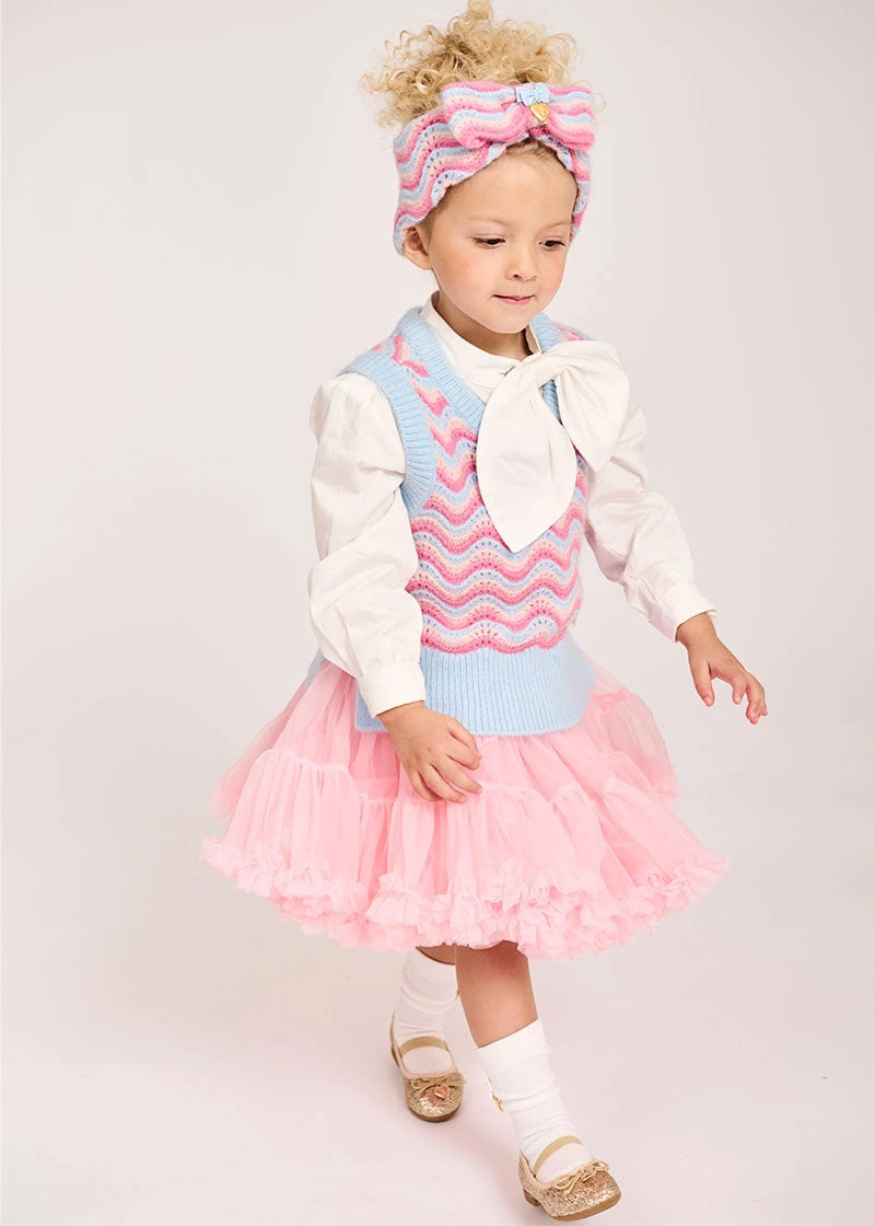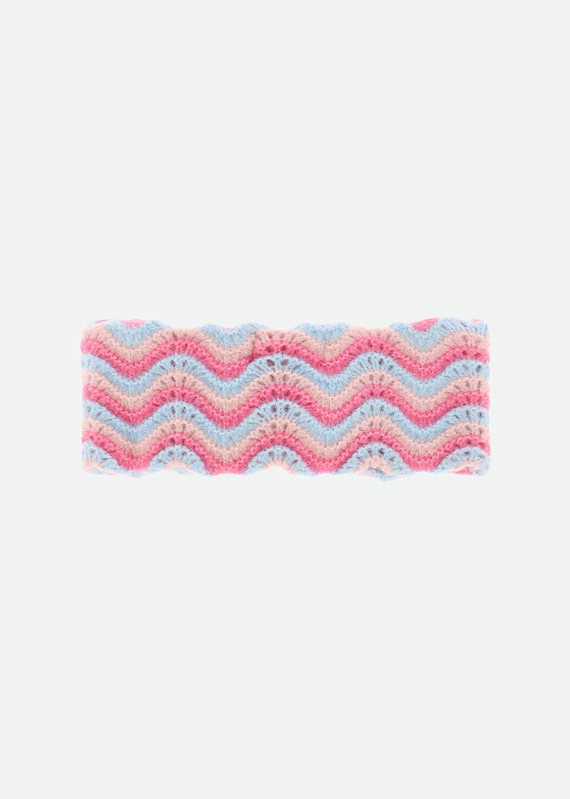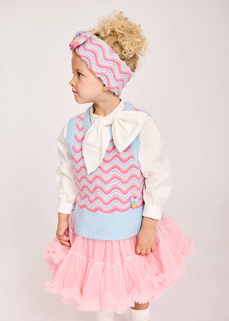 Gorgeous knitted headband for girls in this seasons blue multi colour wave knit. Headband features a large knitted bow complete with our classic bow and gold heart charm in the centre.