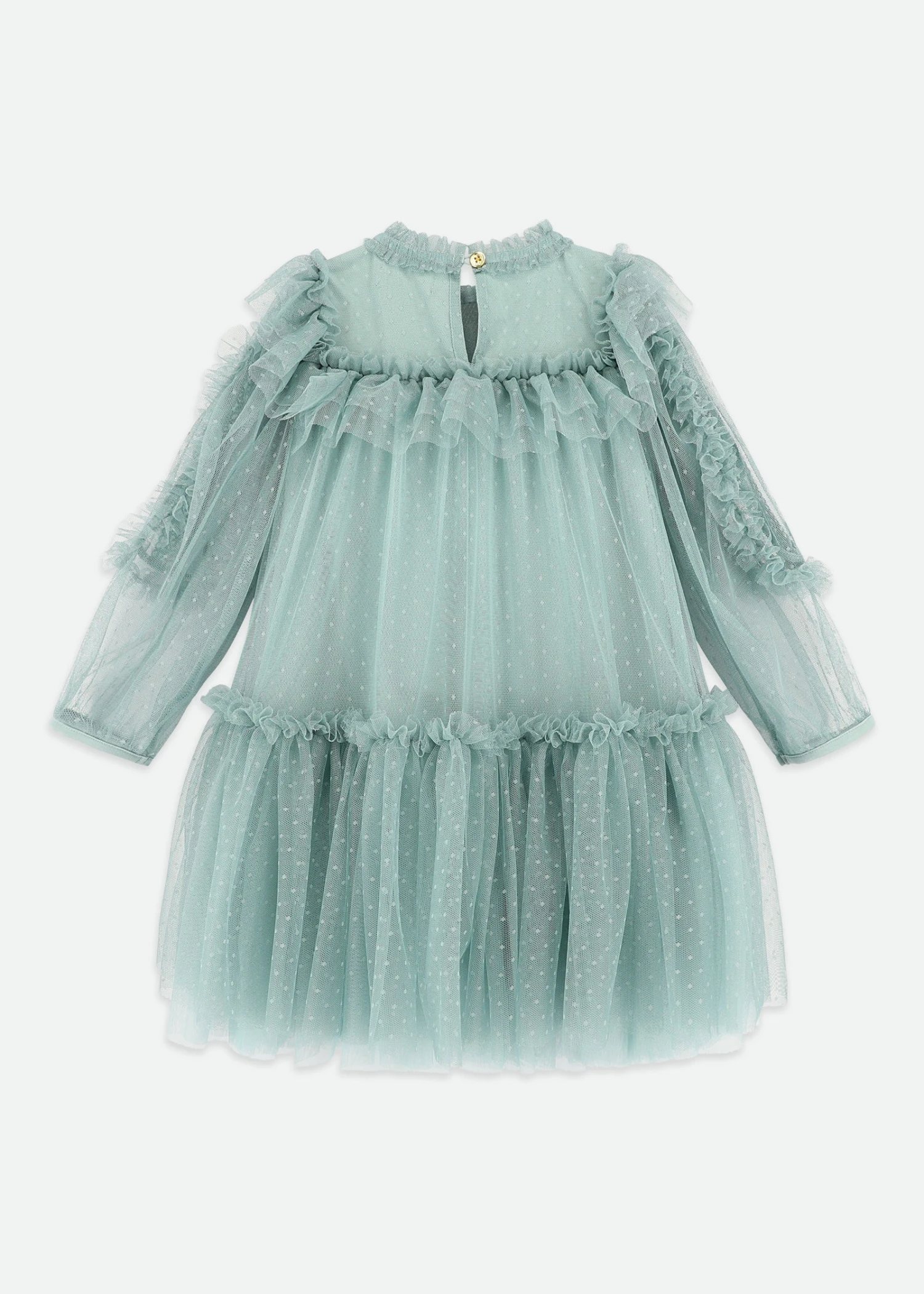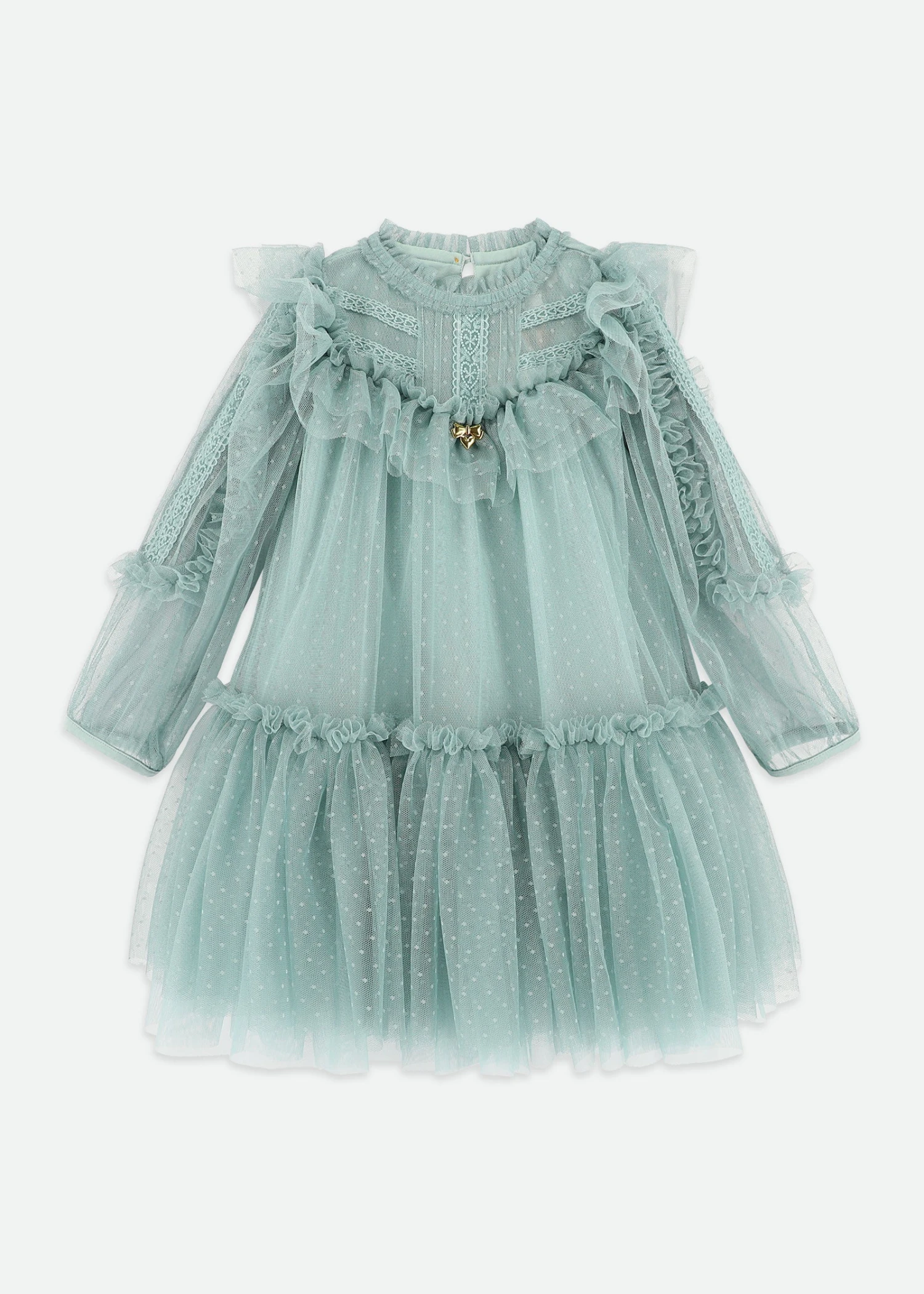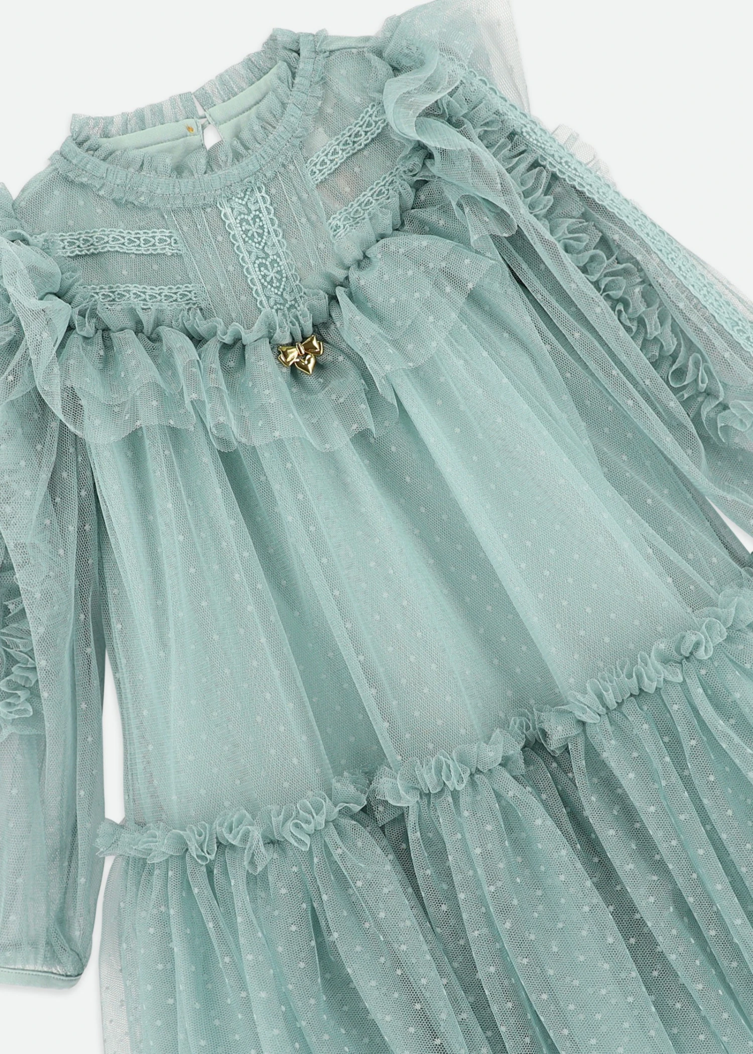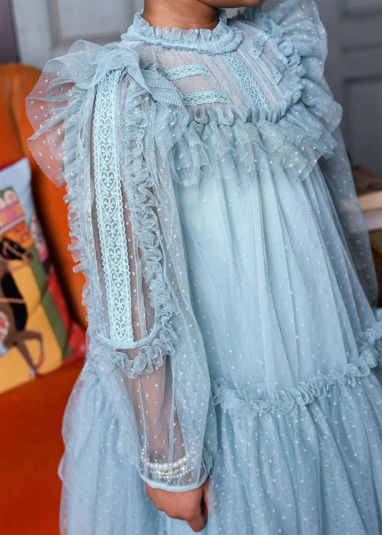 Bring fairytale charm to her wardrobe with this enchanting duck egg blue dress. Crafted in delicate spot tulle, it features beautiful ruffles around the neckline, bodice, and skirt, along with intricate lace trims for a vintage-inspired feel. Sheer long sleeves add an elegant touch, while the soft cotton lining ensures comfort. Finished with our signature gold heart charm, it’s perfect for parties, special occasions, or simply feeling like a princess every day.