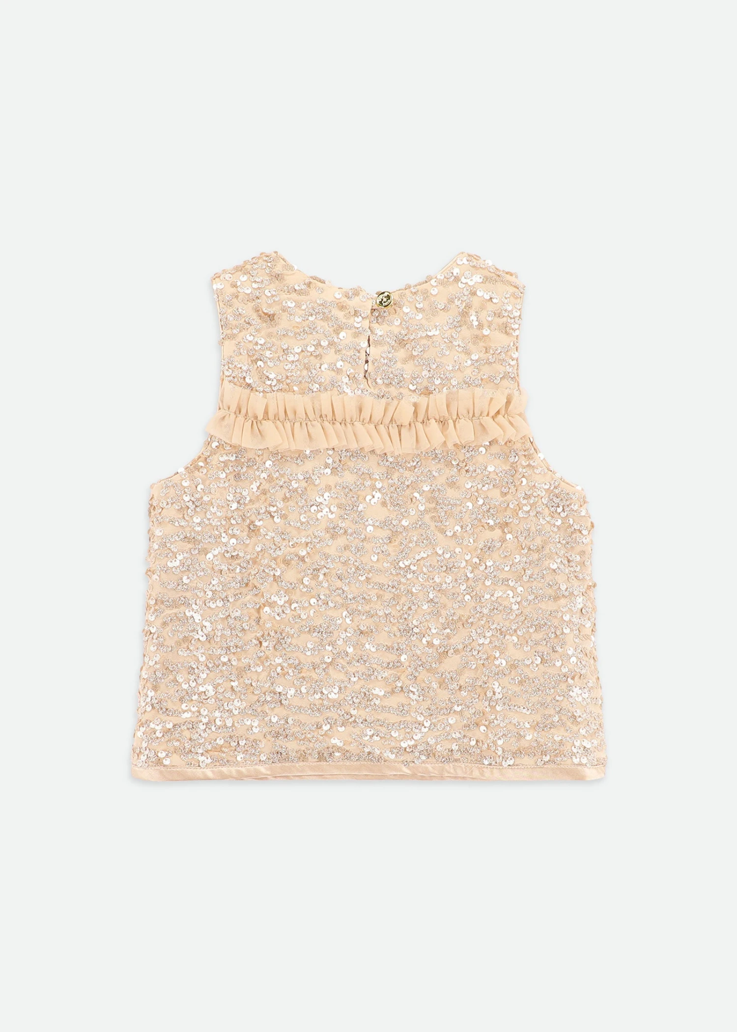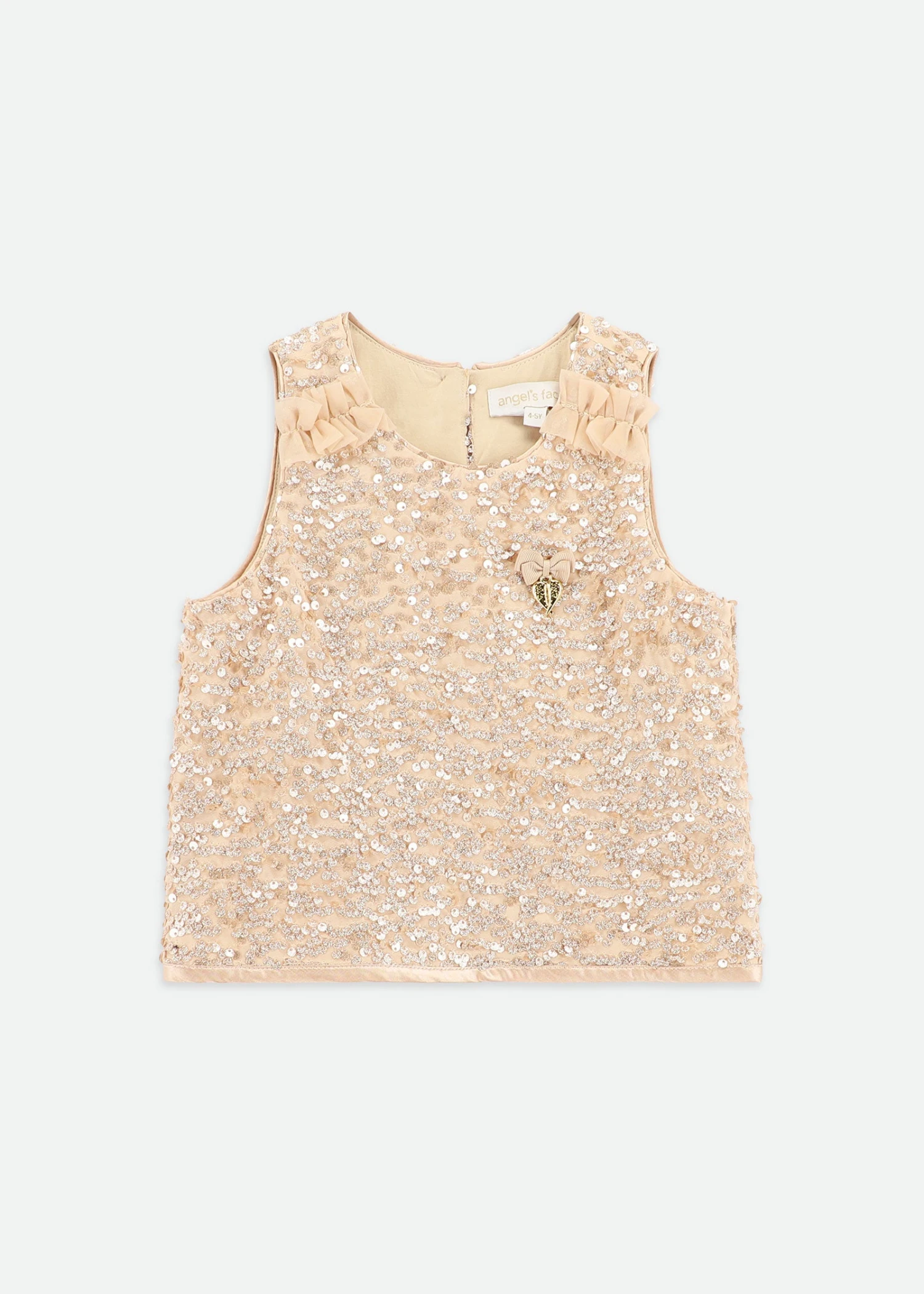 Girls caramel vest top with a sparkling sequin shell. Round neck sleeveless top, fastens at the back with our signature Angels Face gold button. Features an Angel’s Face signature bow and gold heart charm on the chest. Fully lined for comfort.
