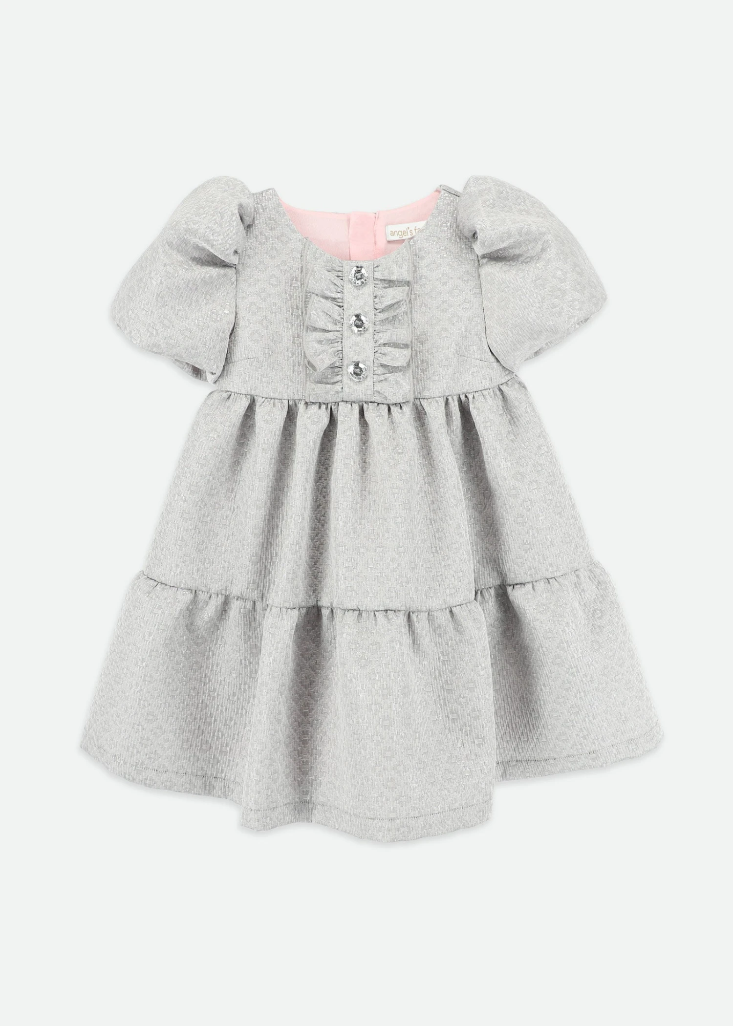 Make any day feel like a celebration in this platinum jacquard dress for girls. Designed with a shimmering textured fabric, it has sweet puff sleeves and a pretty tiered skirt that’s perfect for twirling. Sparkling crystal buttons and a frilled placket add extra charm, while the soft pink lining ensures it feels as lovely as it looks.