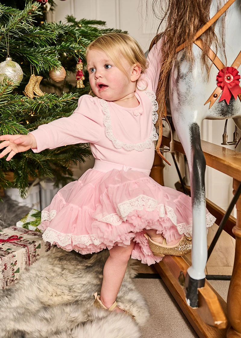 This tutu is not packaged in our Striped Hat Box. Angel’s Face Iconic tutu for baby. Skirt is gathered into a soft stretch waistband, fully lined with a comfortable cotton blend. Layers of soft tulle and ruffles create volume and bounce complete with our signature bow and gold heart charm on the waist. The beautiful blue tutu features a lace trim around the hem.