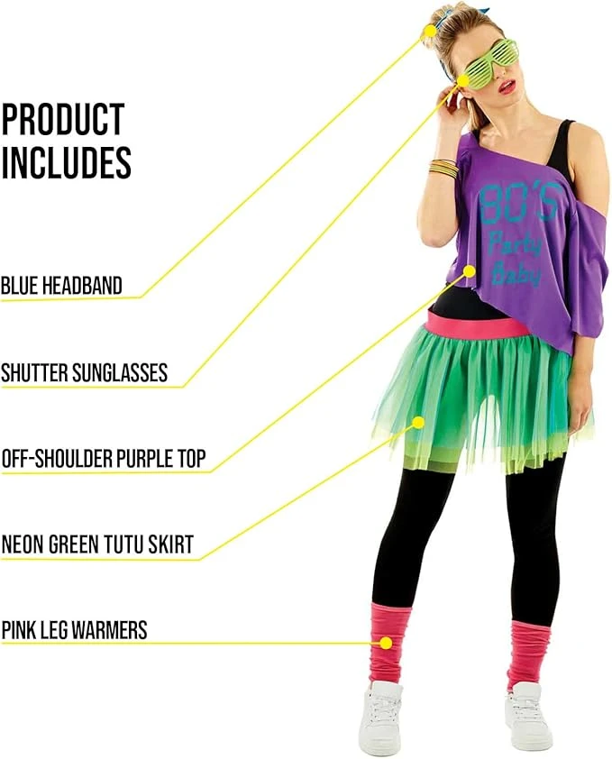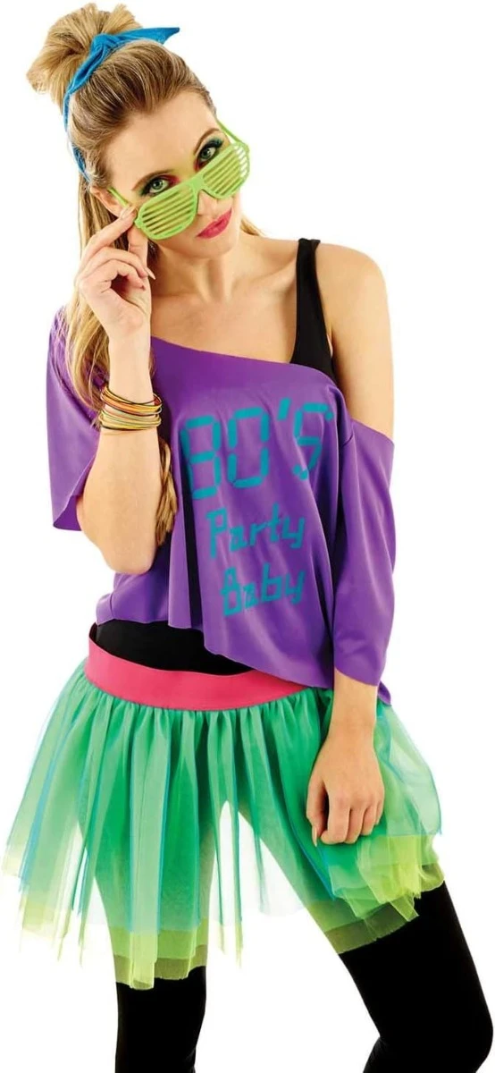 Include: una gonna tutù verde fluorescente, un top viola con spalle scoperte, occhiali da sole a persiana, scaldamuscoli rosa e una fascia blu.Questo costume per adulti è disponibile in taglia: Unica. Usare l’immagine di riferimento per la misura delle taglie. Materiali di alta qualità, facile da indossare e resistente.La nostra Azienda è stata fondata nel 2009 da 3 amici appassionati di costumi. Abbiamo uffici in USA, UK ed Europa con centinaia di design che rispettano il massimo degli standard di qualità.