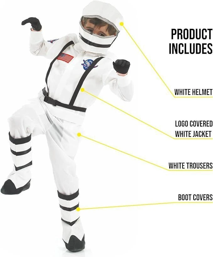 Il costume include: una giacca bianca con logo, pantaloni abbinati, copri stivali tinta unita e casco abbinato.Questo costume per bambini è disponibile in taglia: S, M, L, XL. Usare l’immagine di riferimento per la misura delle taglie. Materiali di alta qualità, facile da indossare e resistente.Sicuro per i bambini: rispetta gli Standard di Sicurezza EU e UK ed ha il marchio di sicurezza CE.