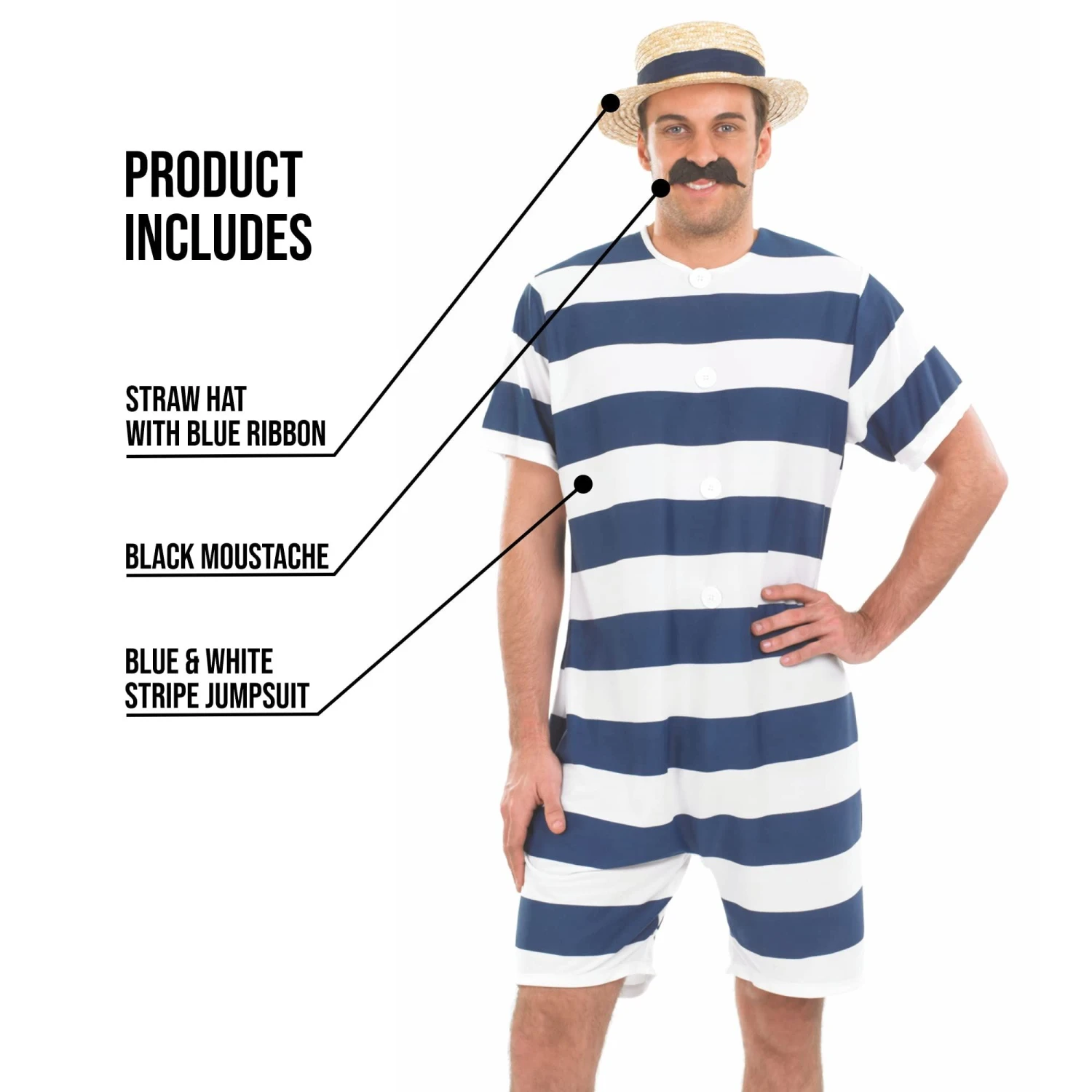 Include: tuta a righe bianche e blu, cappello di paglia con nastro blu e baffi neri.Questo costume per adulti è disponibile in taglia: M, L, XL. Usare l’immagine di riferimento per la misura delle taglie. Materiali di alta qualità, facile da indossare e resistente.La nostra Azienda è stata fondata nel 2009 da 3 amici appassionati di costumi. Abbiamo uffici in USA, UK ed Europa con centinaia di design che rispettano il massimo degli standard di qualità.