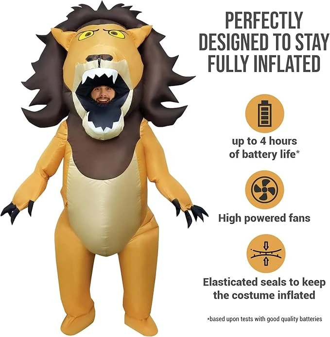 This lion costume for men is an absolutely huge inflatable outfit that’s bound to bring fun and laughs to any costume event you go to. Whether it’s an animal theme party or you just want to be king of the jungle for the day, this inflatable lion outfit will see you stand head and shoulders above the rest of the pride. Each lion costume comes with a fan and battery pack (batteries not included) that is designed to keep the fun going for hours! Order your inflatable lion costume today.