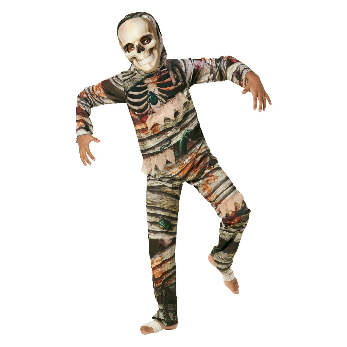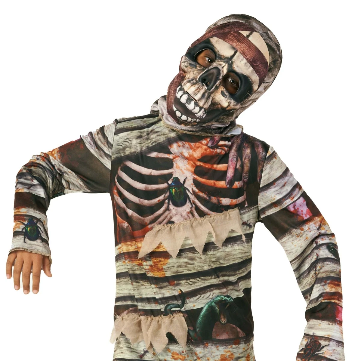 Il costume da mummia per bambini ha due facce! Tuo figlio può scegliere tra un classico volto di teschio bianco o una spaventosa faccia di teschio di mummia bendato. Se non vogliono indossare la maschera, va bene – possono comunque indossare il costume. Ordina questo fantastico set oggi stesso!