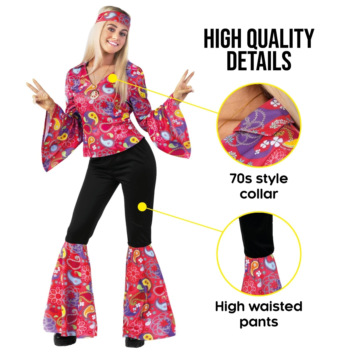 Il costume include: Top, pantaloni e fascia per capelli.Il costume è disponibile in taglia S, M, L, XL e XXL. Usare l’immagine di riferimento per la misura delle taglie.Materiali di alta qualità, facile da indossare e resistente. Top con colletto stile anni ’70. Pantaloni a vita alta.La nostra Azienda è stata fondata nel 2009 da 3 amici appassionati di costumi. Abbiamo uffici in USA, UK ed Europa con centinaia di design che rispettano il massimo degli standard di qualità.