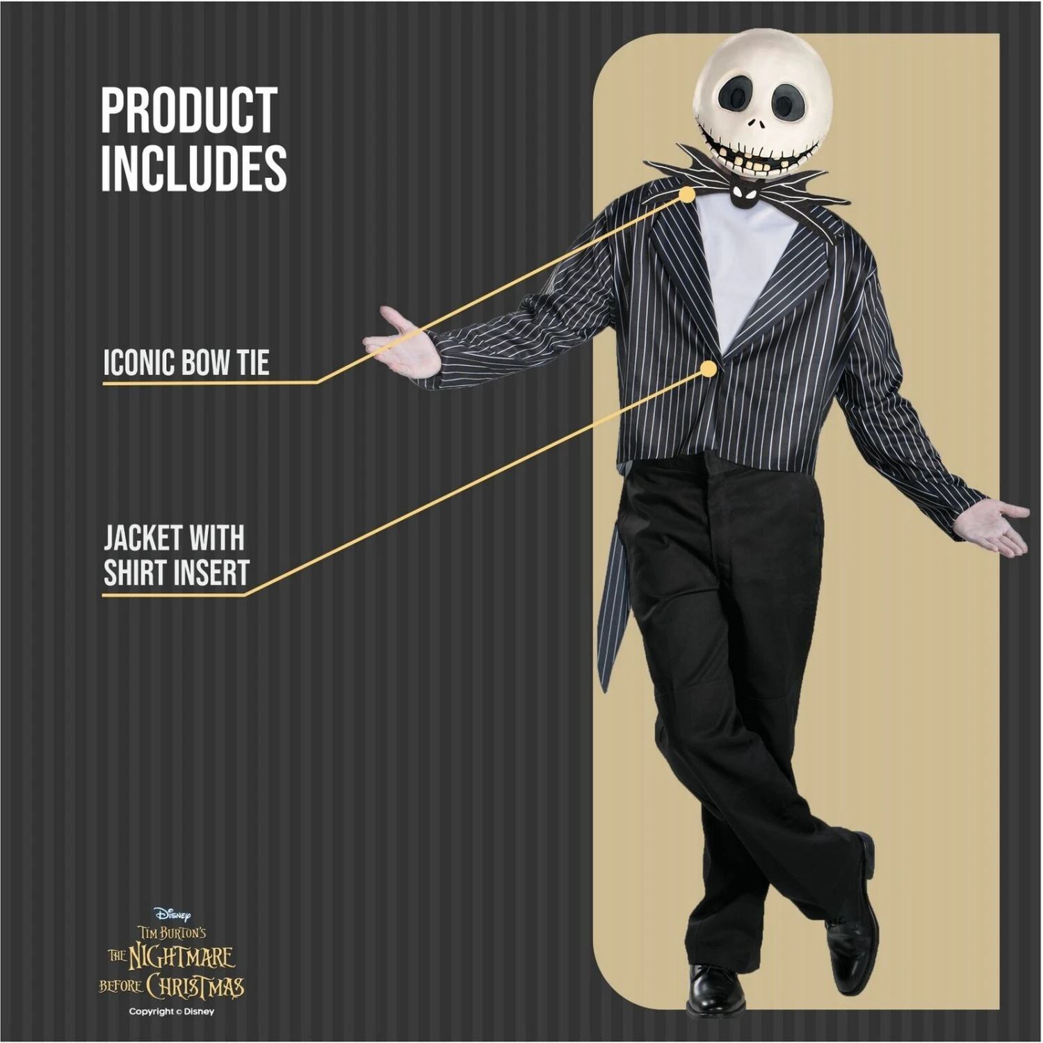 Diventa l’iconico Jack Skeletron di The Nightmare Before Christmas con il nostro costume ufficiale Disney per adulti; include giacca e papillon.Costume bianco e nero di alta qualità con giacca frac cutaway proprio come nel film. Il papillon si chiude intorno al collo con chiusura a strappo ed è a forma di pipistrello.Disponibile in taglia L; si prega di fare riferimento alla tabella delle taglie per ulteriori dettagli.Costume ufficiale Disney: acquista con sicurezza dall’autentico negozio Disney su Amazon.