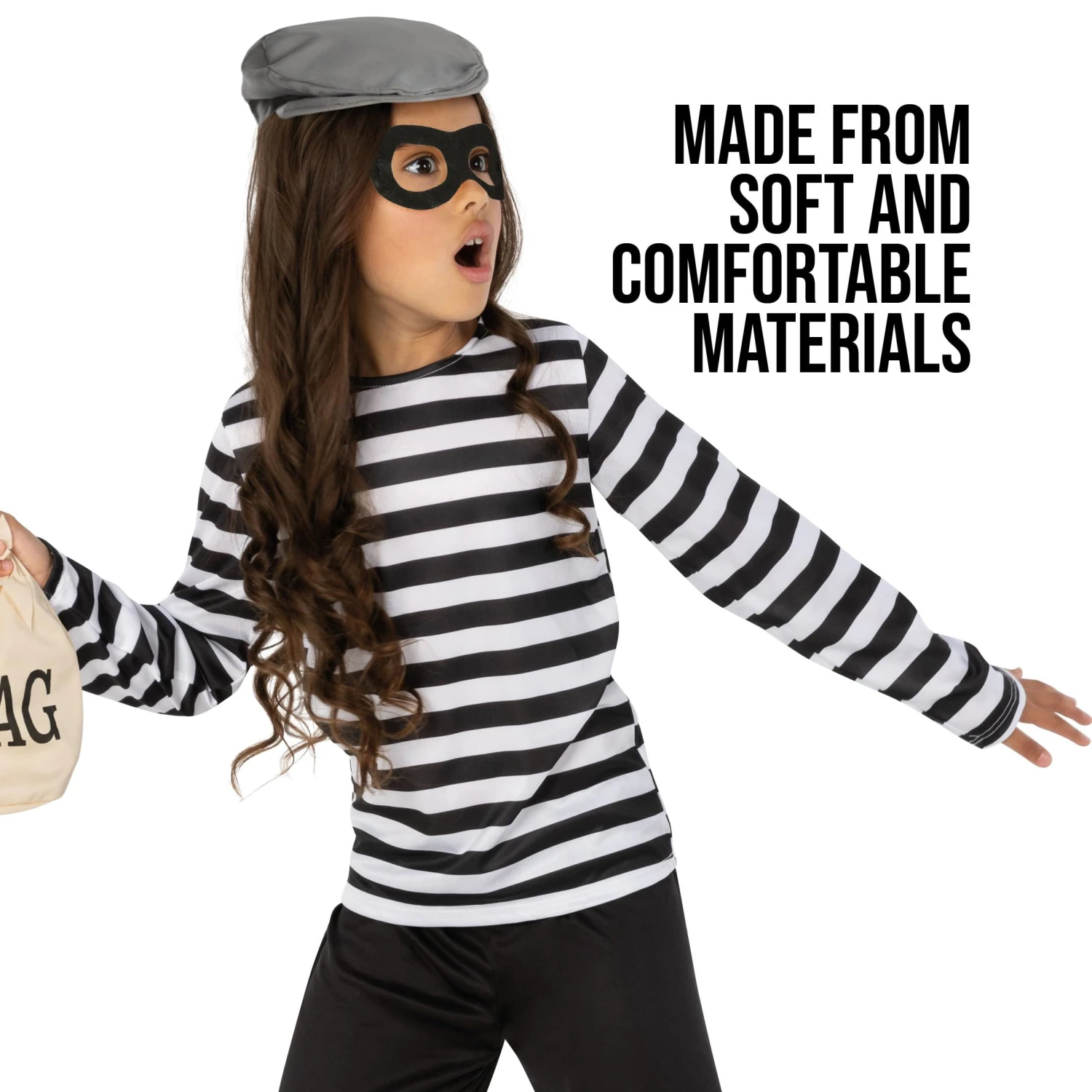 Il costume include: una maglietta a righe, un paio di pantaloni neri, un berretto grigio, una maschera per gli occhi nera ed il sacco della refurtiva.Questo costume per bambini è disponibile in taglia: S, M, L, XL. Usare l’immagine di riferimento per la misura delle taglie. Materiali di alta qualità, facile da indossare e resistente.Sicuro per i bambini: rispetta gli Standard di Sicurezza EU e UK ed ha il marchio di sicurezza CE.