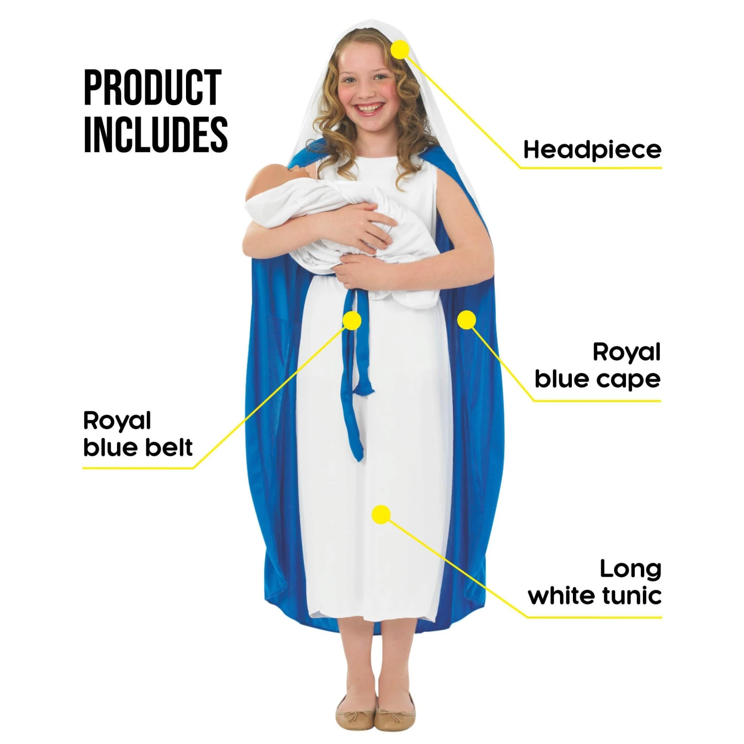 Questo costume festivo per bambina permette a vostra figlia di assumere l’importante ruolo di Maria della classica storia della natività. Ispirato al classico racconto religioso, questo costume da bambina è perfetto se vostra figlia partecipa alla recita del presepe a scuola o se si veste semplicemente per le foto di famiglia. Il costume da Maria per bambini è composto da una lunga tunica bianca, un mantello blu a tutta lunghezza e un copricapo coordinato.