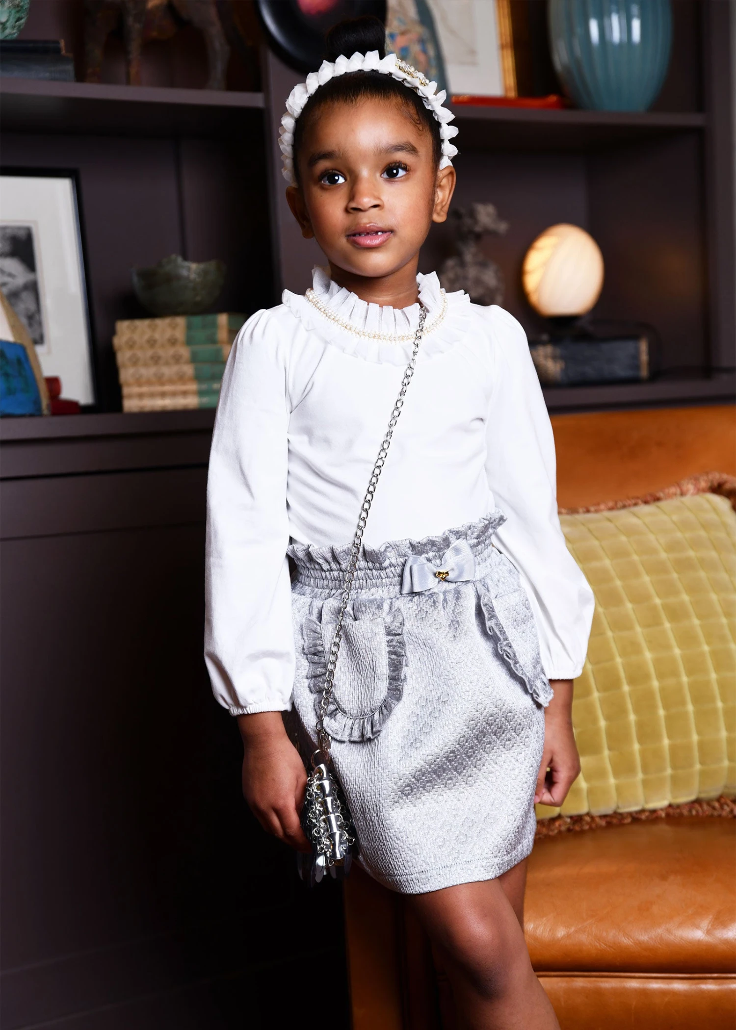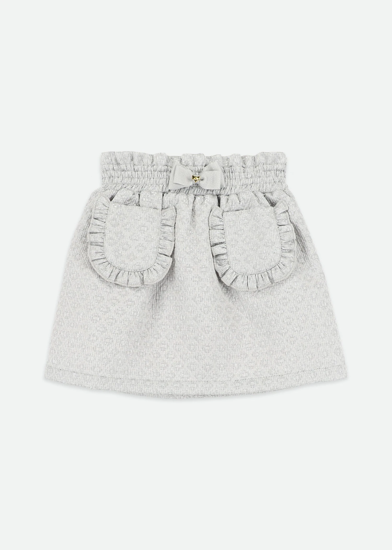 Classy silver jacquard skirt for girls. The skirt features an elastic ruched waistband with Criss-cross stitching and Angel’s Face signature bow and gold charm on the waistband. Featuring two front patch pockets, with frills on the front. The skirt is fully lined in a soft blend and falls on the knee.