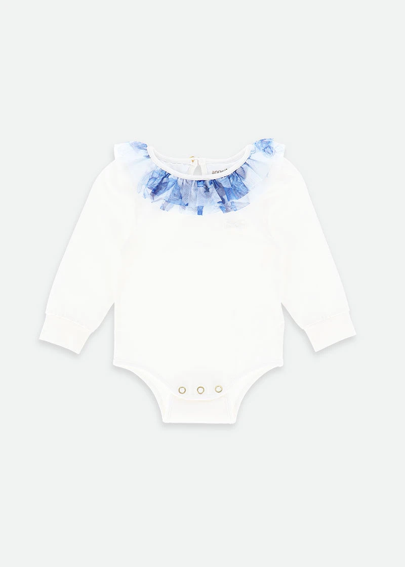 Adorable white long sleeve baby grow with a blue flower tulle collar, fastening at the crotch with comfortable poppers and logo button on the back neck. Baby grow is made from a soft cotton with a touch of elastane for extra stretch and movement, complete with our signature bow on the chest.
