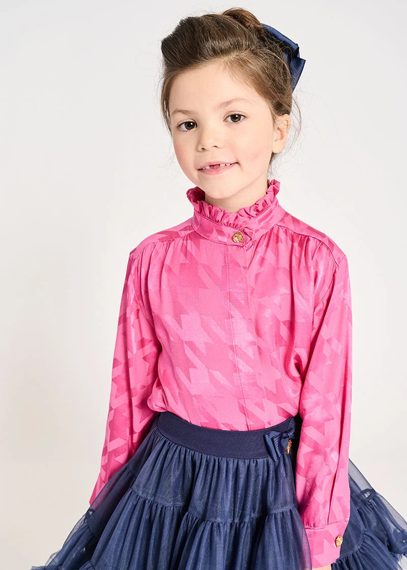 Our Dana blouse in our vibrant pink houndstooth is a glamourous wardrobe edition for your angel. This showstopper blouse is finished in luxury with crystal heart buttons and a pretty frill edging the collar.