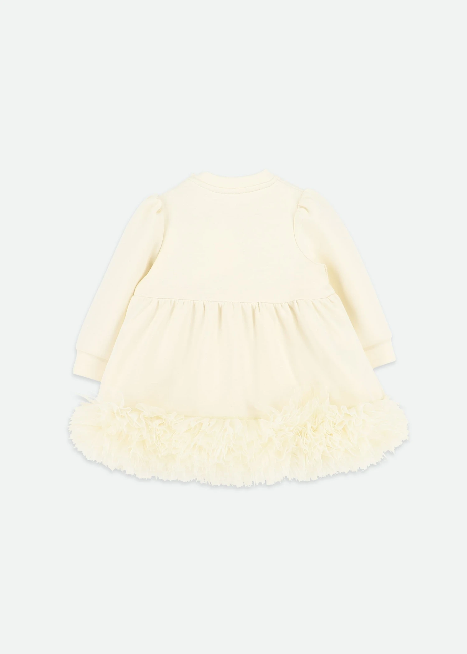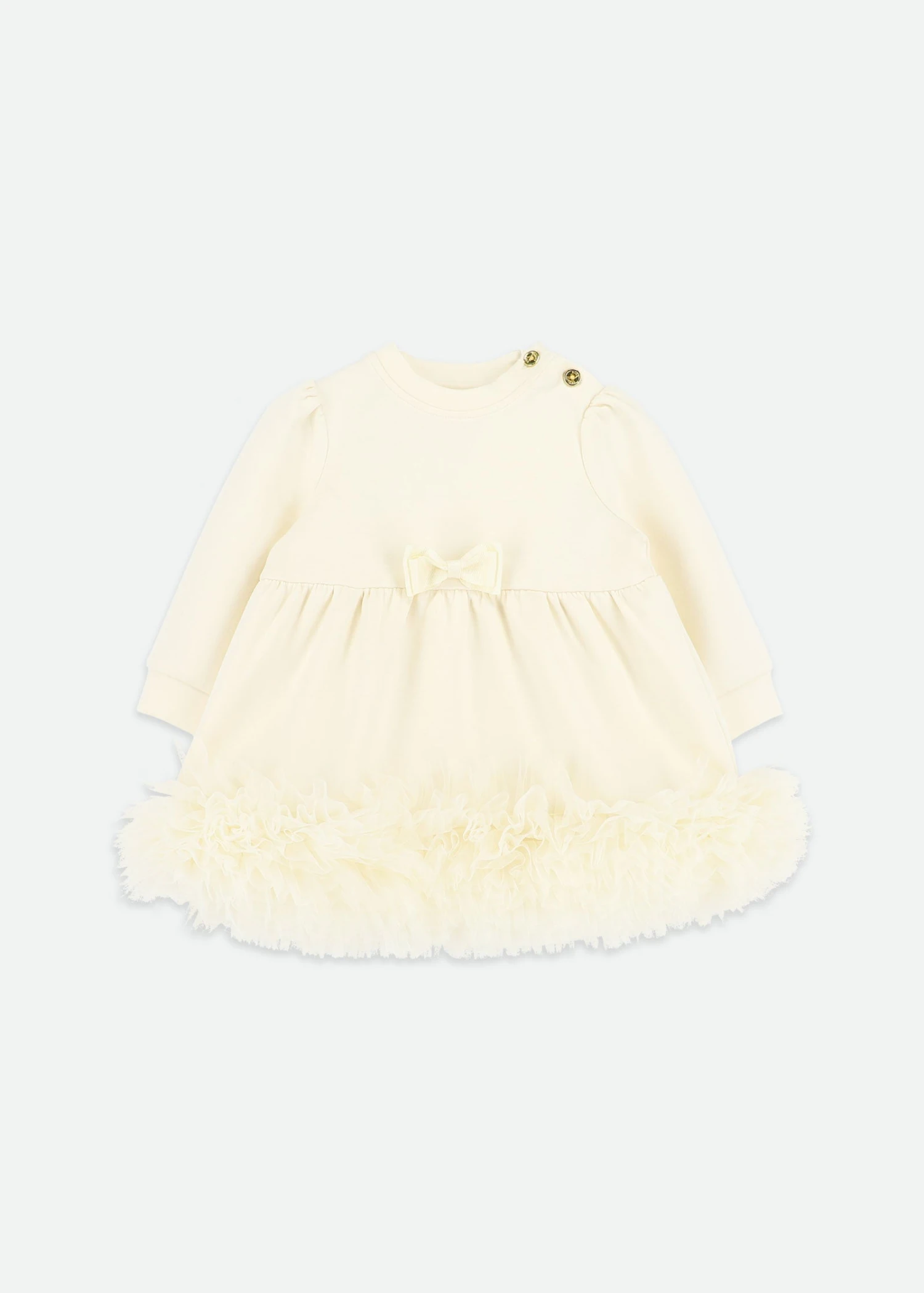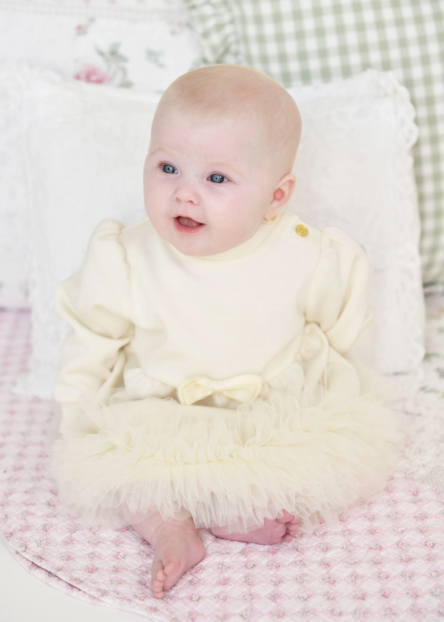 Make every day feel special in this beautiful vanilla dress for baby girls. Made in soft cotton jersey, it features a gathered skirt trimmed with delicate ruffled tulle for a lovely layered look. A grosgrain bow sits neatly on the front, adding a touch of Angel’s Face magic. Easy to dress, the design fastens with gold logo buttons on the shoulder.