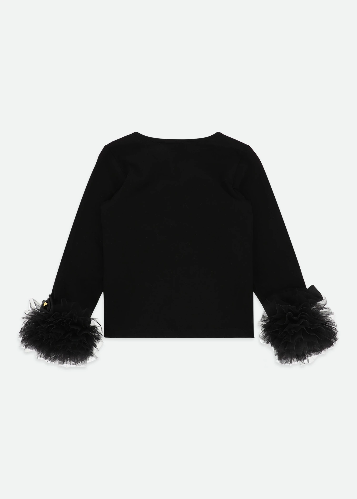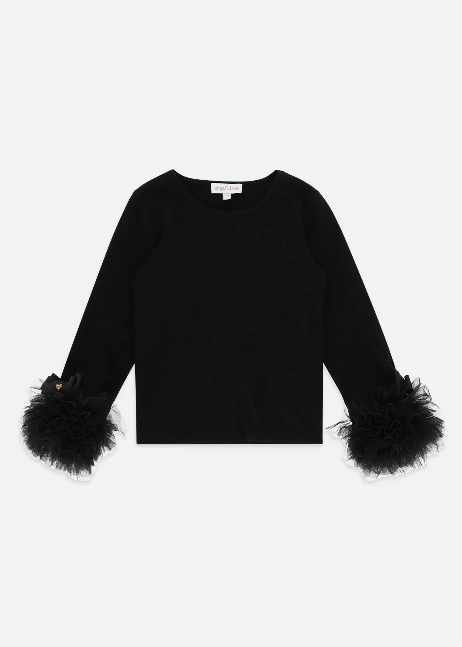 Make every day feel special in this adorable black long-sleeve top for girls. Soft cotton jersey keeps it comfy, while the statement cuffs steal the show with layers of frothy tulle frills. Finished with a cute grosgrain bow and our signature gold heart charm for a touch of sweetness. Perfect for dressing up any outfit or pairing with skirts for a party-ready look.