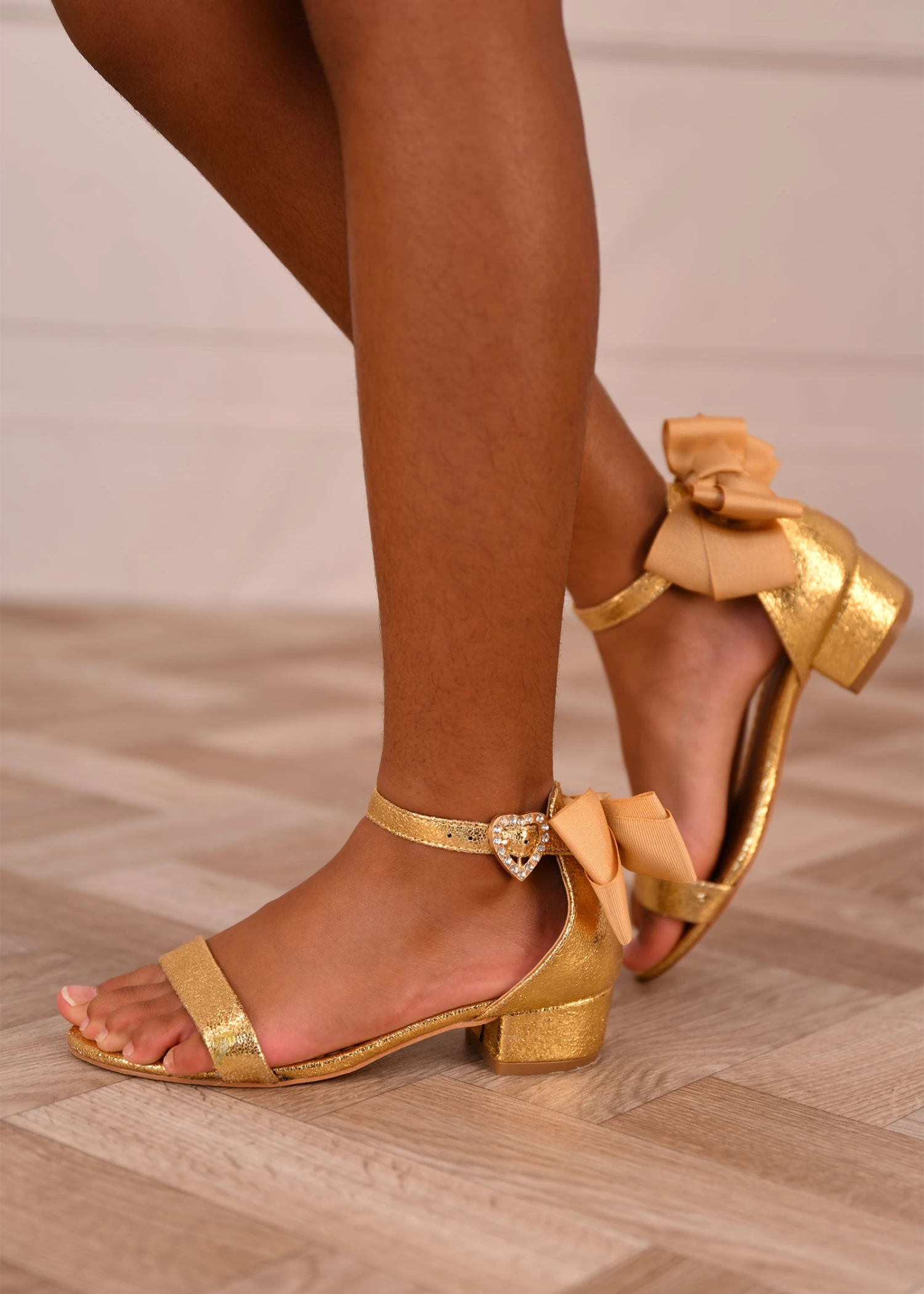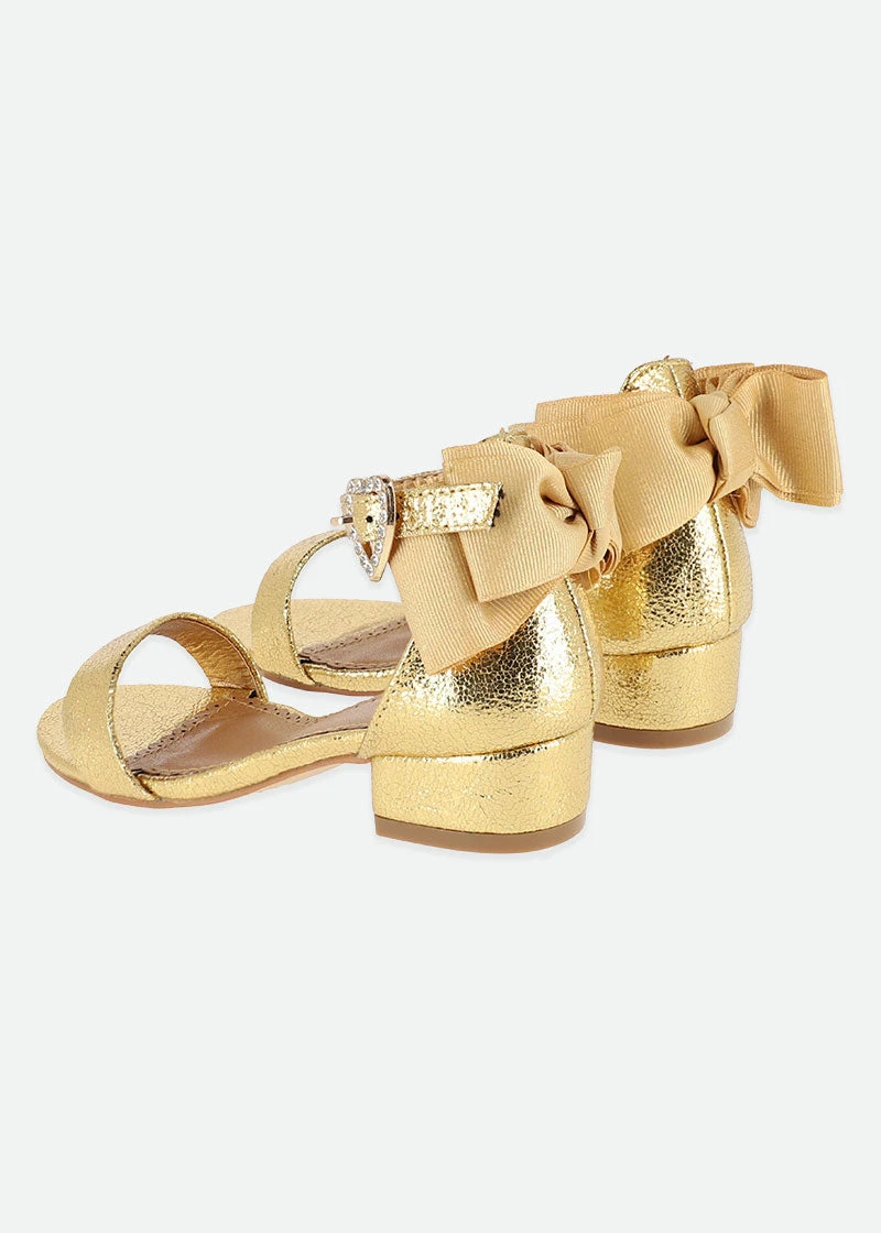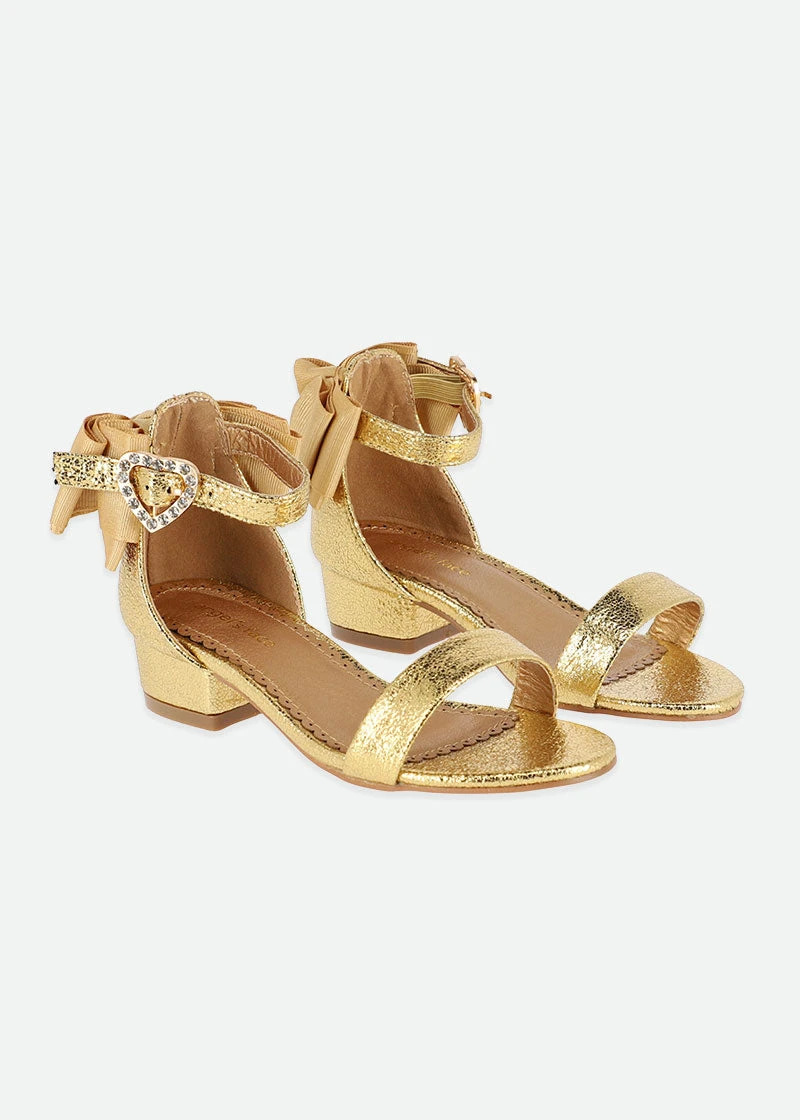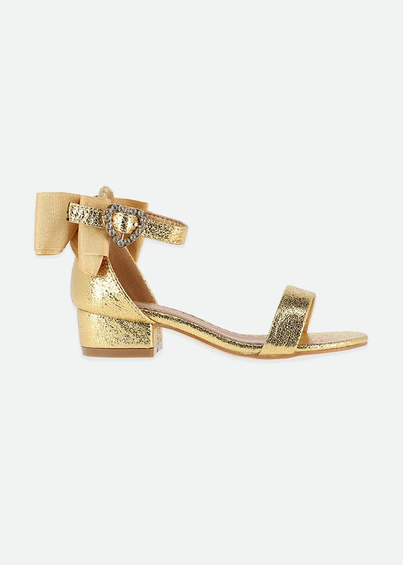 Girls special occasion heel sandals in metallic gold. Stylish shoe is complete with our iconic bow on the back, 3.5 cm heel and fastens at the side with a diamanté heart buckle.