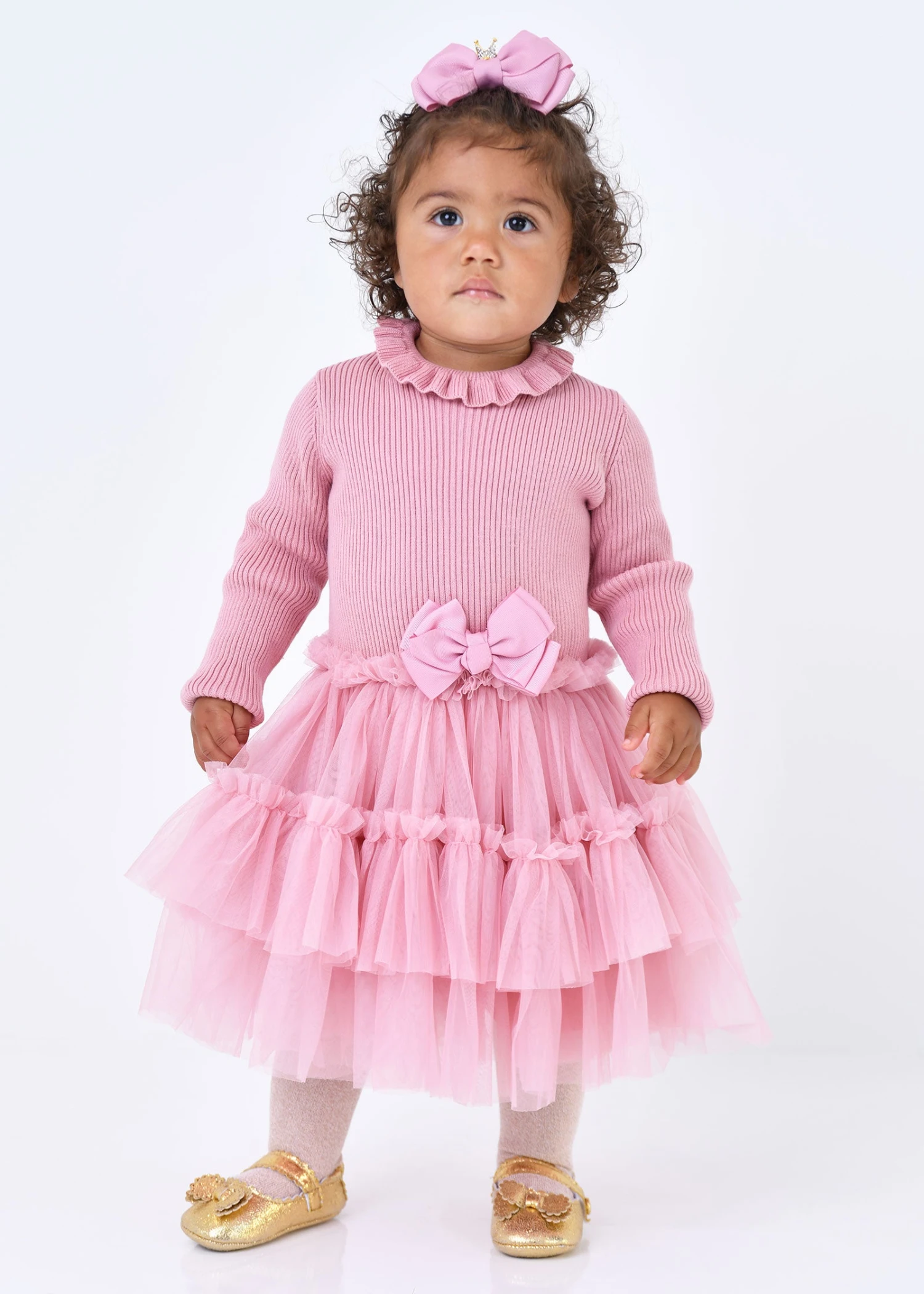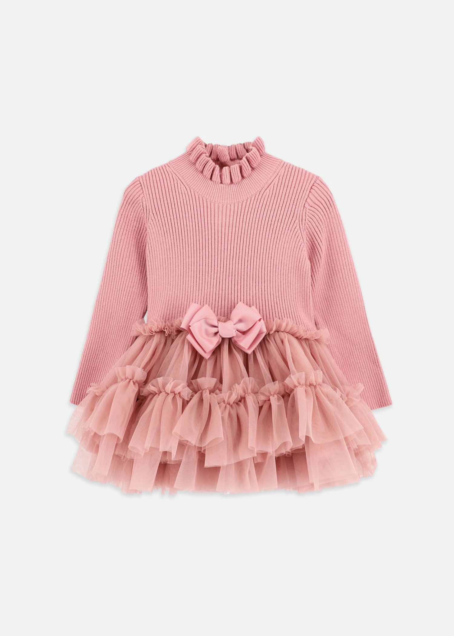 Elegant ribbed jumper dress with tulle layered skirt in Tea Rose. This dress features layers and layers of soft tulle with a cotton lining. Finished with a frilled neck and our signature bow on the waist. Fastens at the back with three gold logo buttons for easy changing.