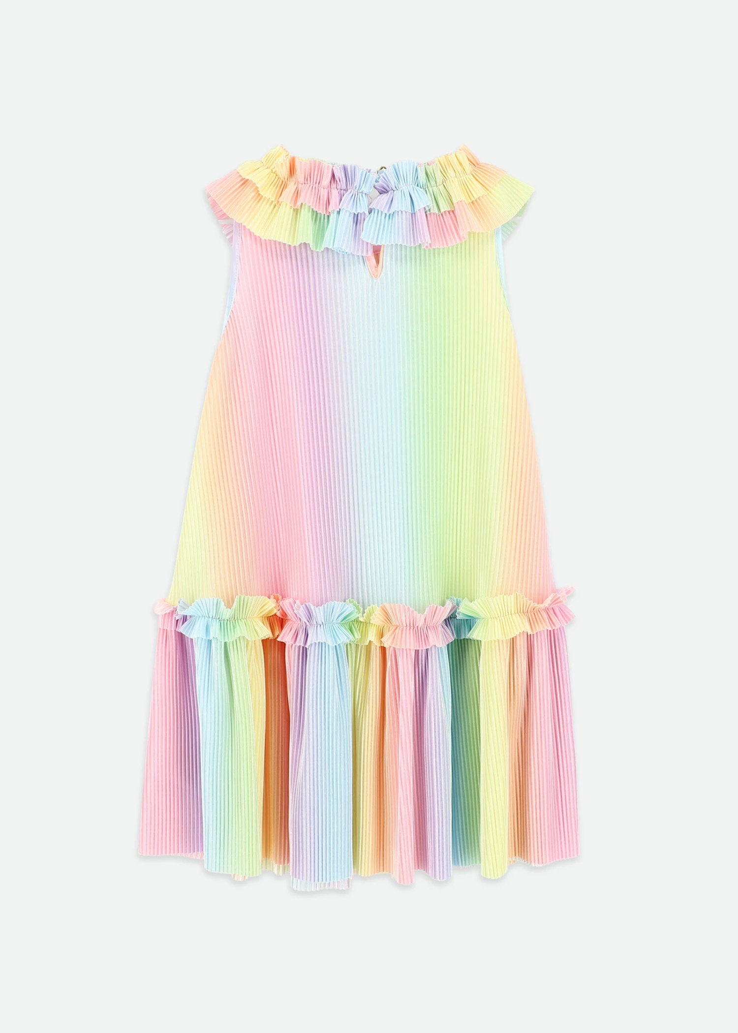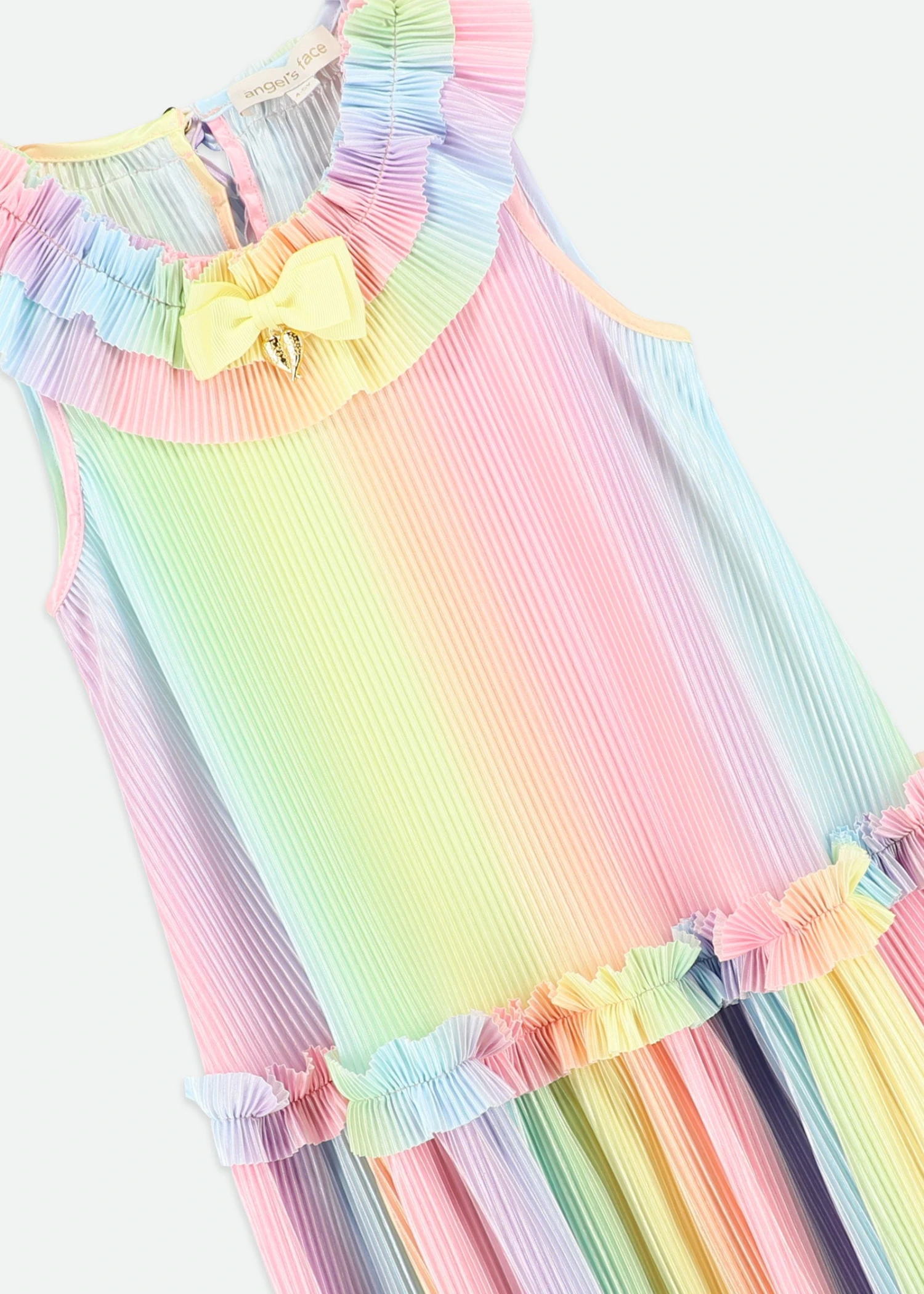 Super soft dress in rainbow with fortuny pleats. This dress features an elegant ruffled neckline and an easy-to-wear A-line shape. Detailed with Angel’s Face signature bow and gold heart charm on the neckline. The dress fastens at the back with gold logo button.