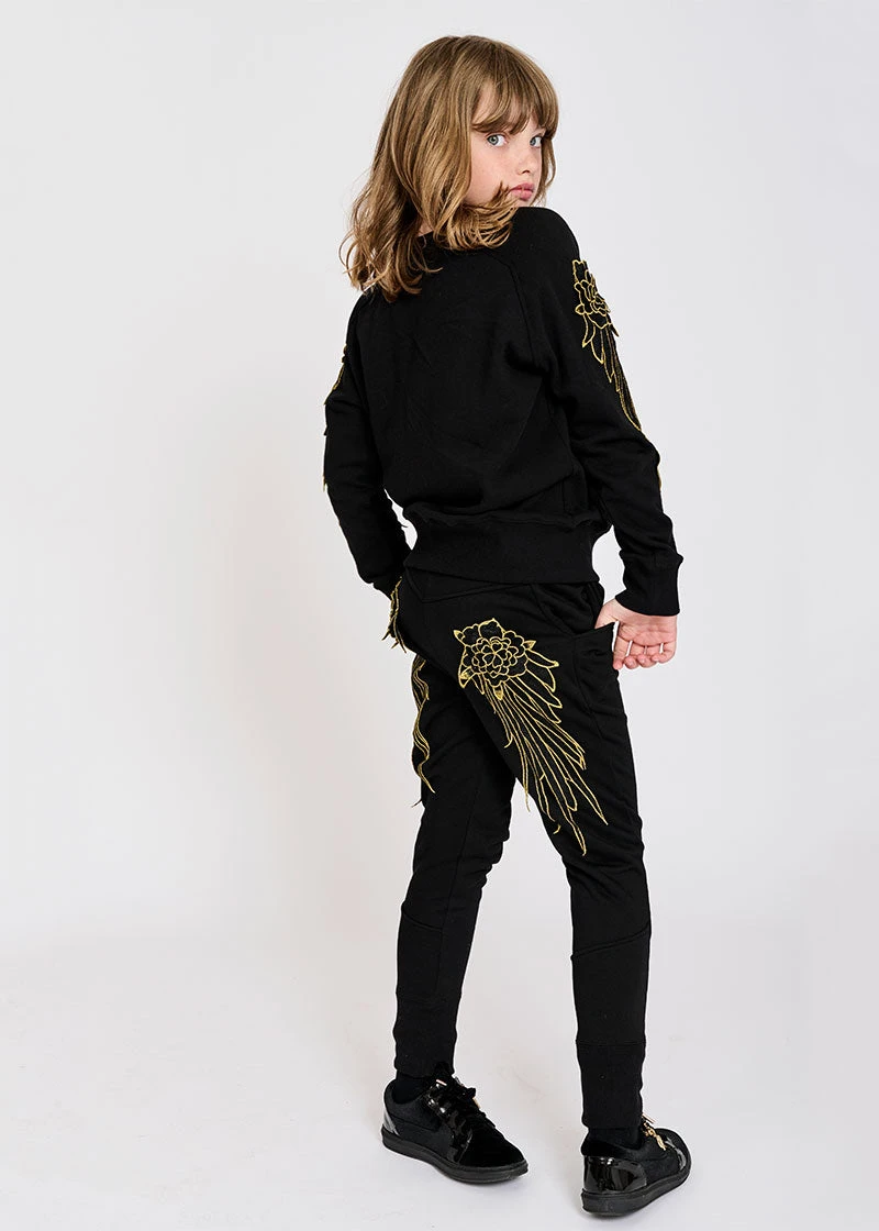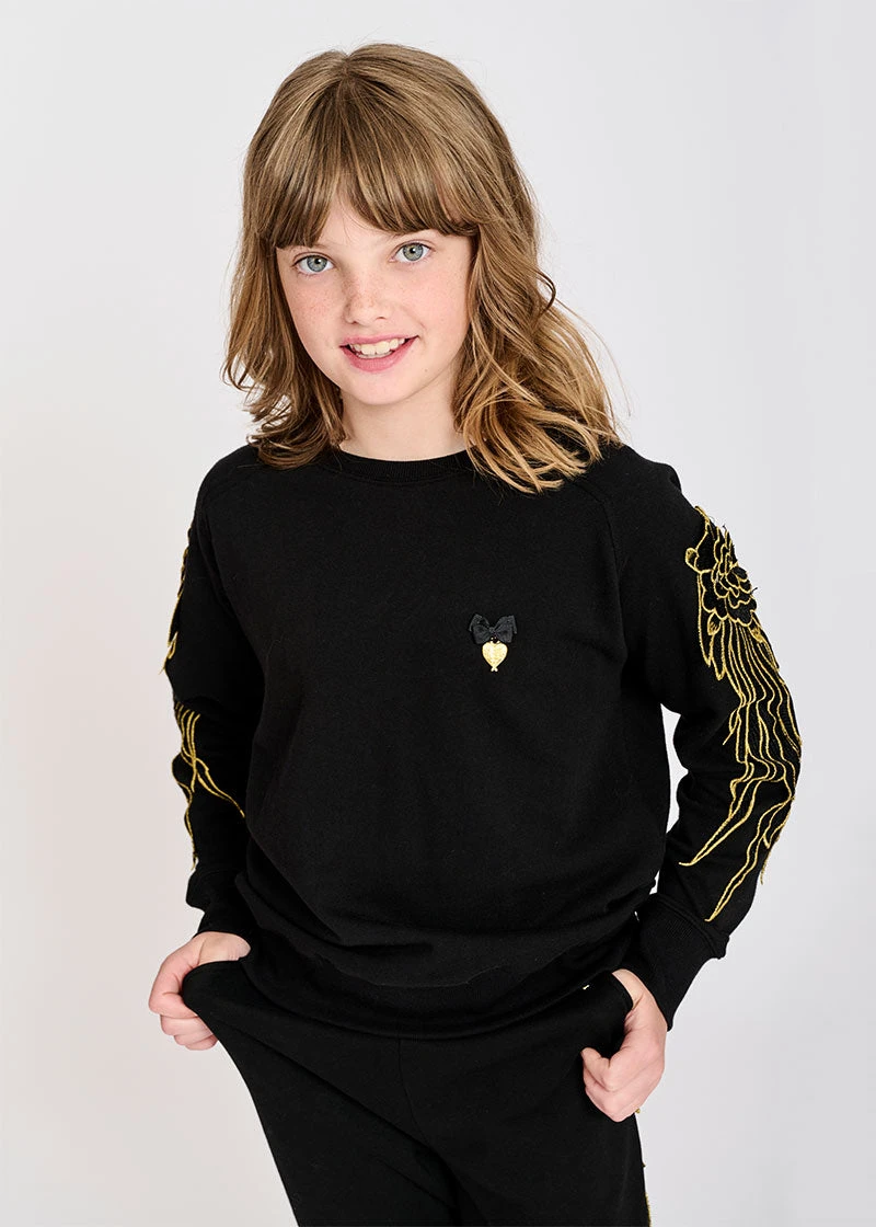 Made from traditional cotton jersey sweatshirt fabric, our Emelia tracksuit top is lightweight and made to sit on the waistband of the coordinating Emma joggers. The sleeve has beautiful gold embroidered wing detailing, making it far from ordinary. On the front is our signature bow and gold heart charm.