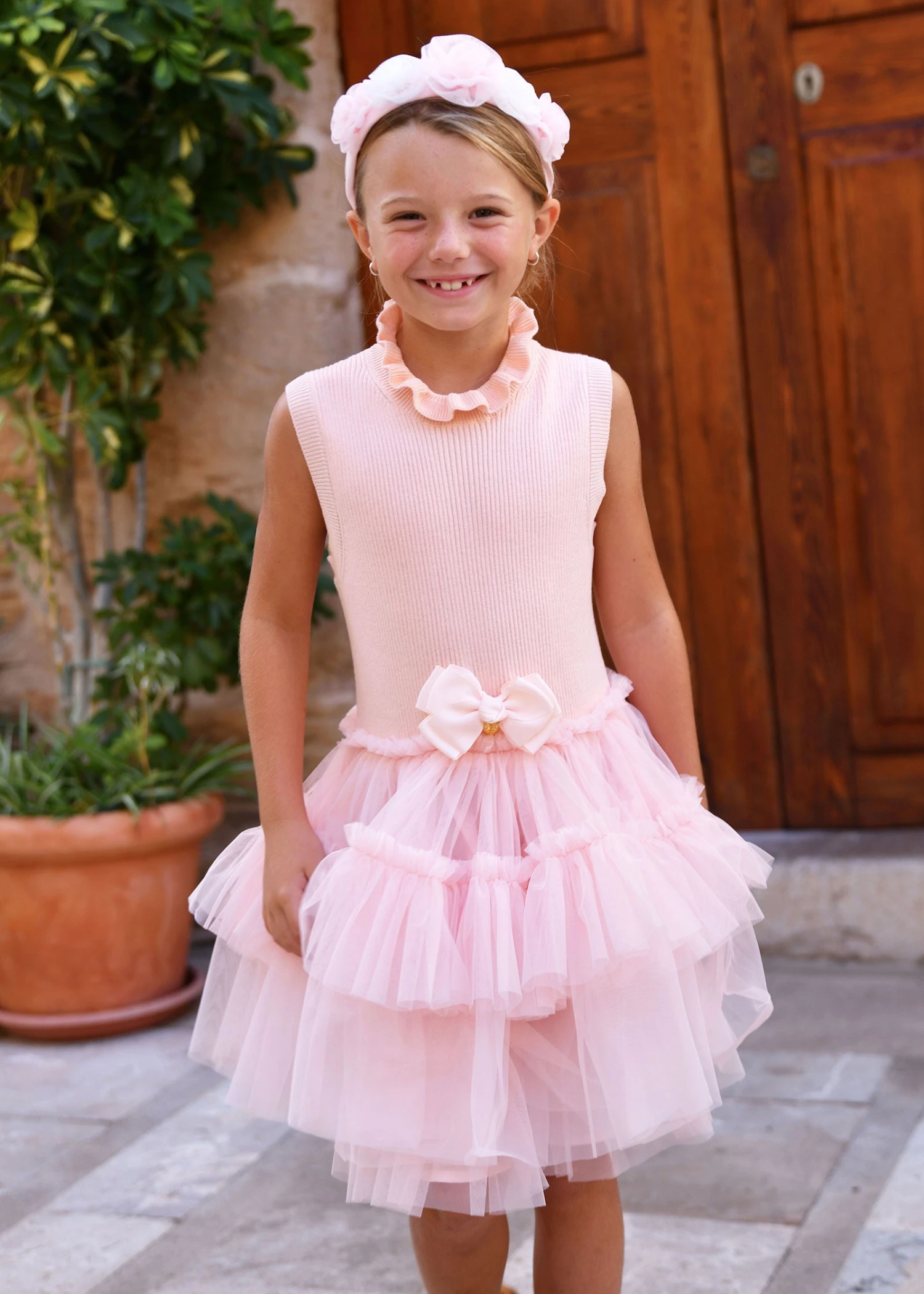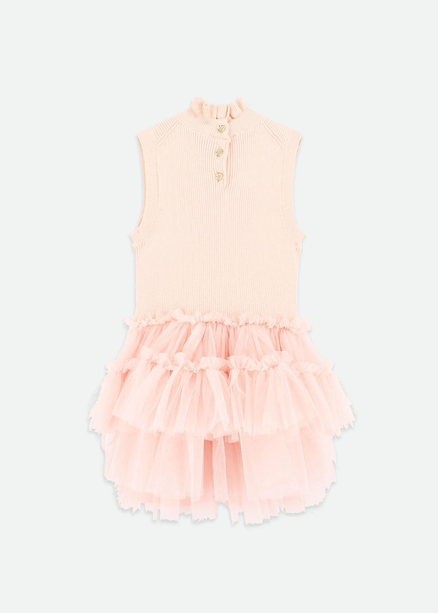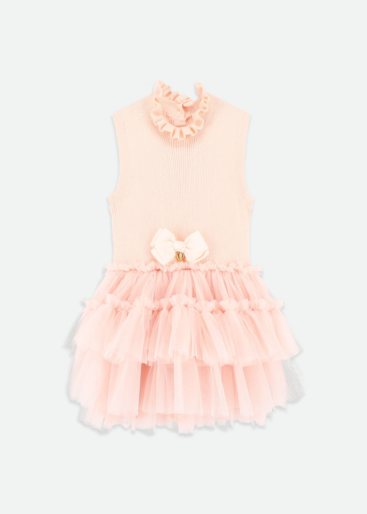 Eunice is an elegant sleeveless high-neck dress with layered pleated tulle on a ribbed cotton bodice. This dress features layers and layers of soft tulle with a cotton lining. Finished with a frilled neck and our signature bow and charm on the waist.