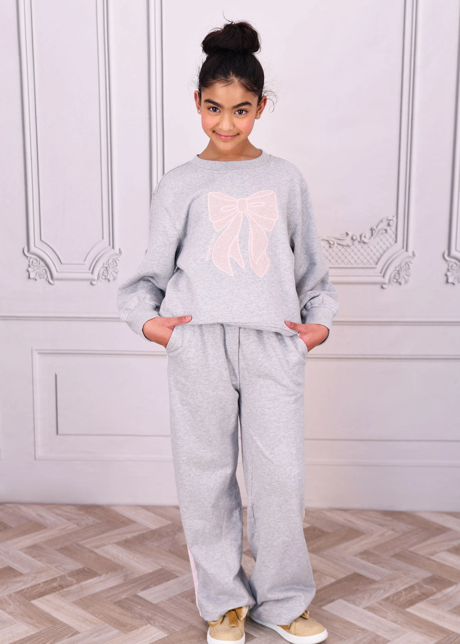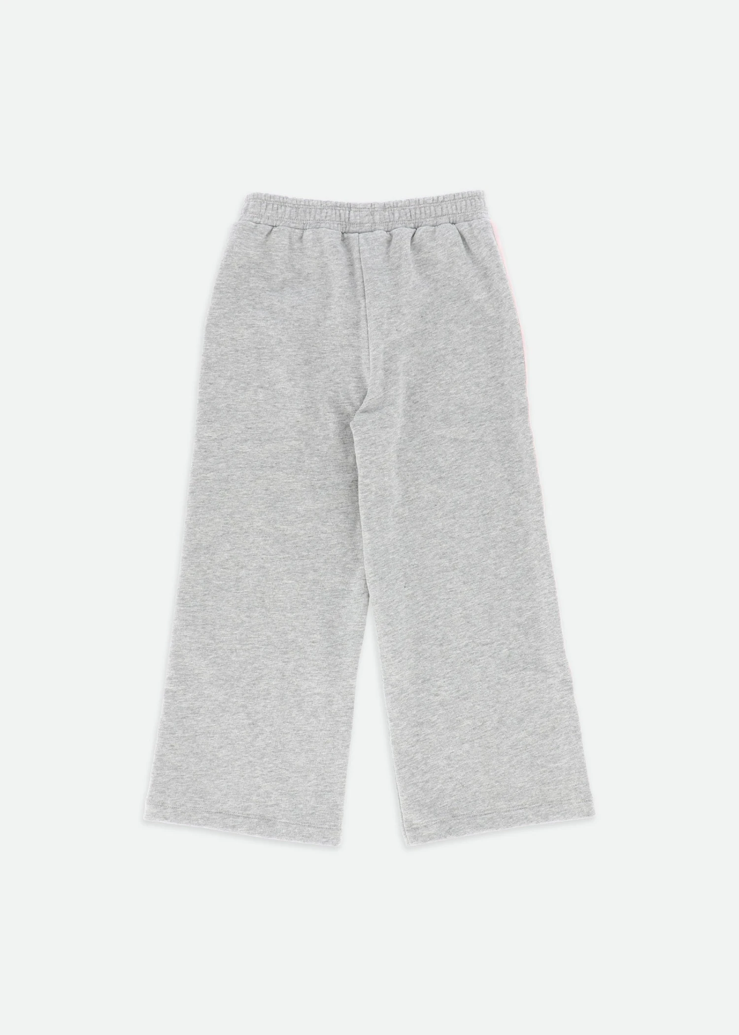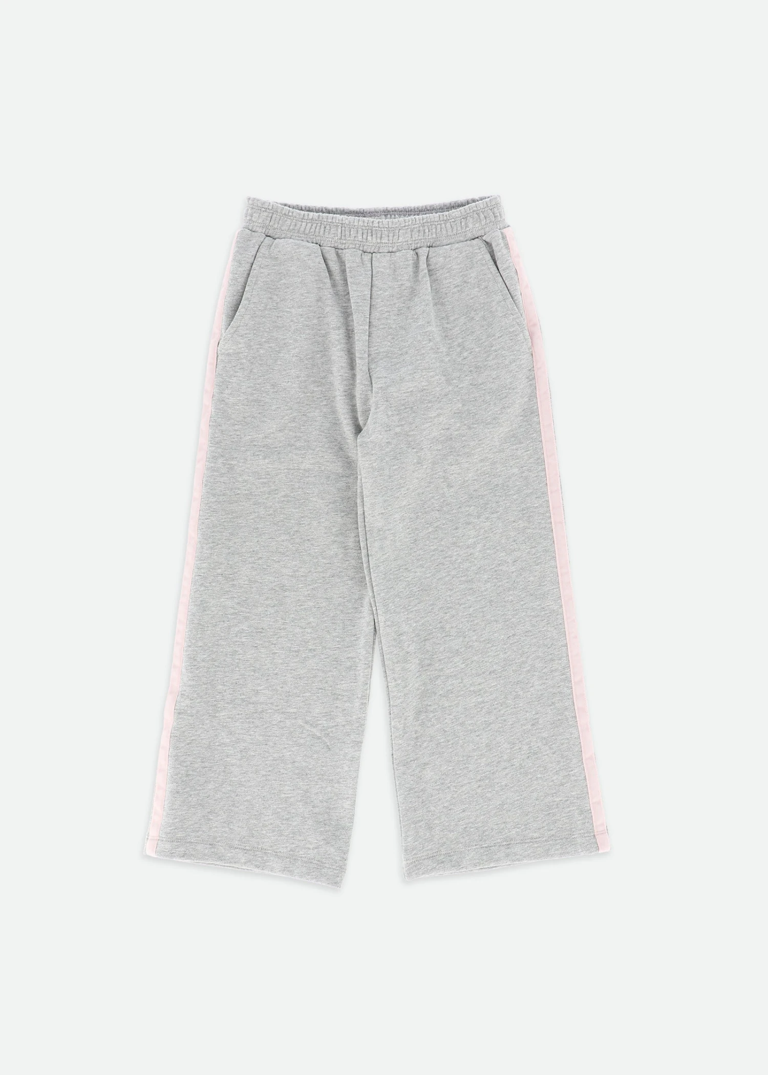 Make every day fell fun in these cute grey jogger trousers for girls. Made in soft cotton jersey for ultimate comfort, they have light pink grosgrain ribbon trims down the sides for a pretty touch. The relaxed wide-leg shape and elasticated waistband make them perfect for lounging, playing, or casual days out.