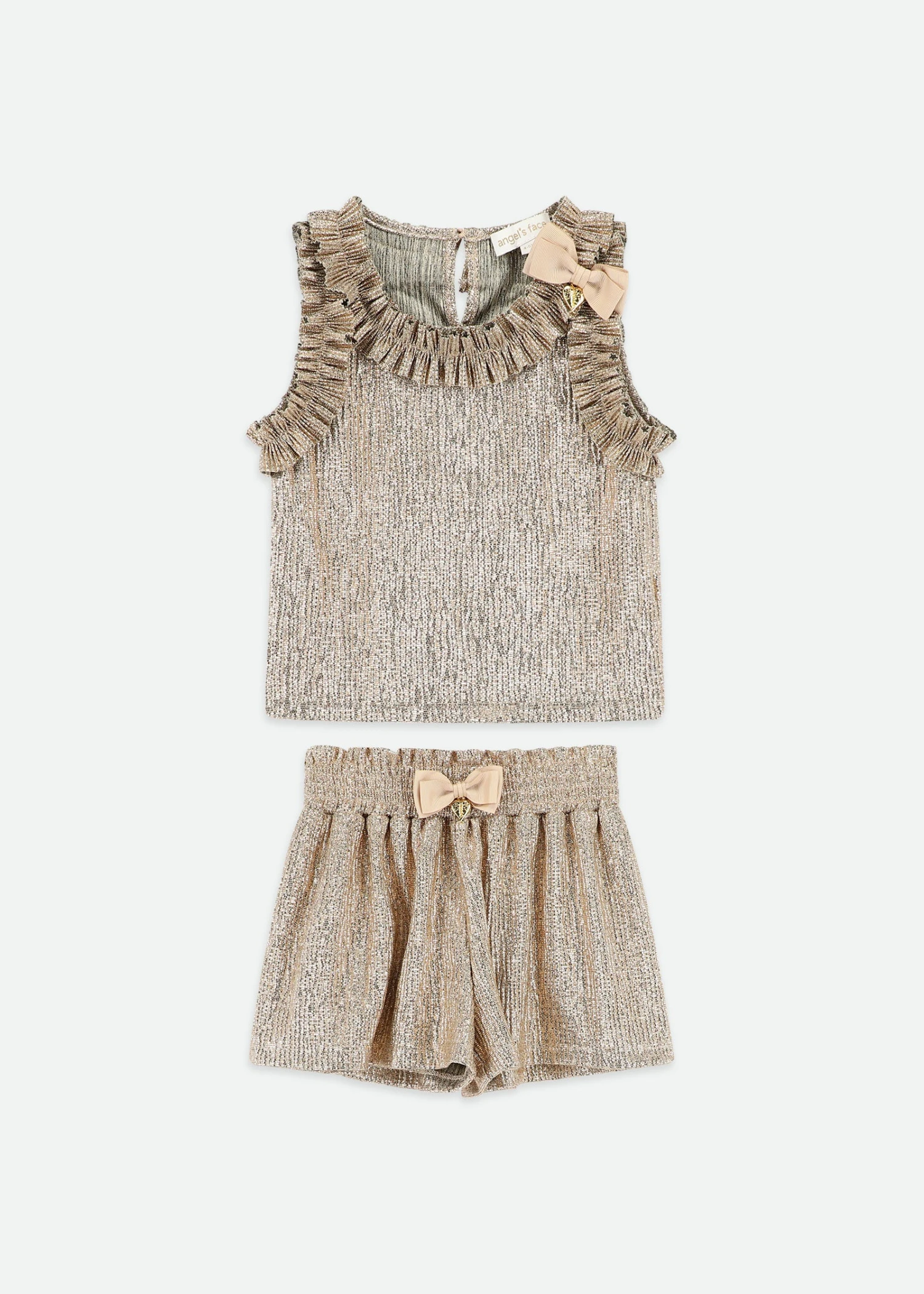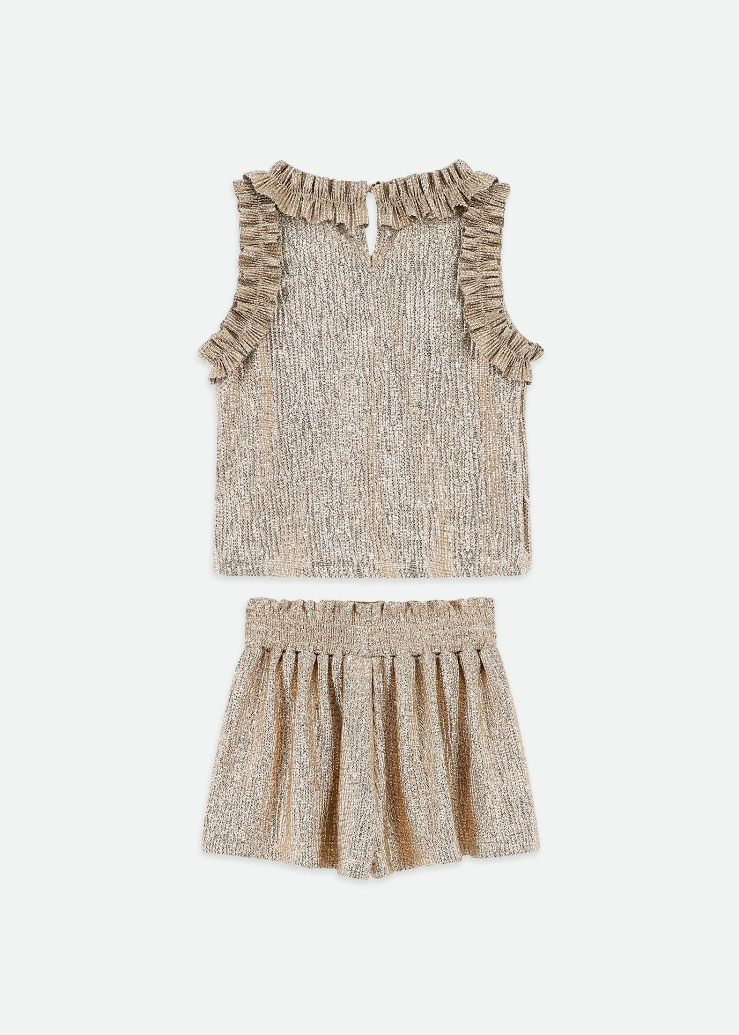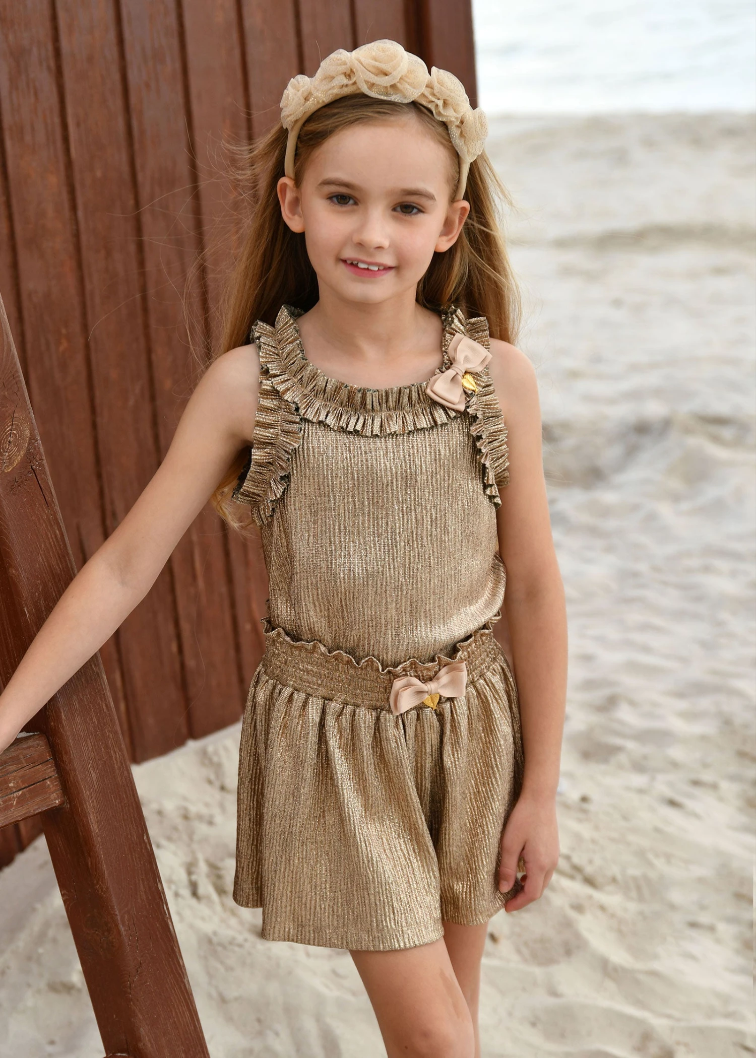 Finished with fortuny pleats throughout, this light and flowy set can be dressed up and down for any occasion. The shorts are easy to pull on with a stretchy waist and the top fastens at the back with a gold logo buttons. Featuring an Angel’s Face signature bow and gold heart charm on the neckline and waistband.