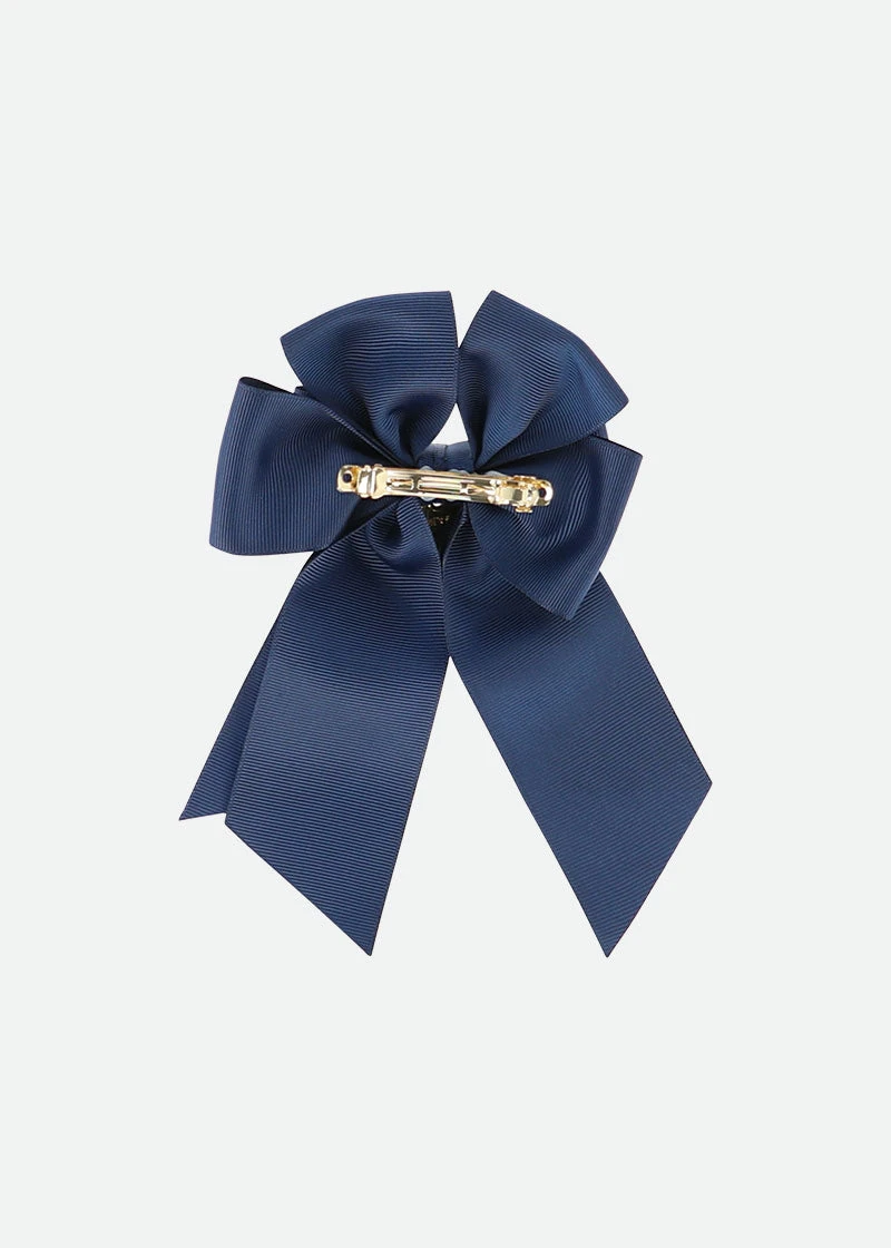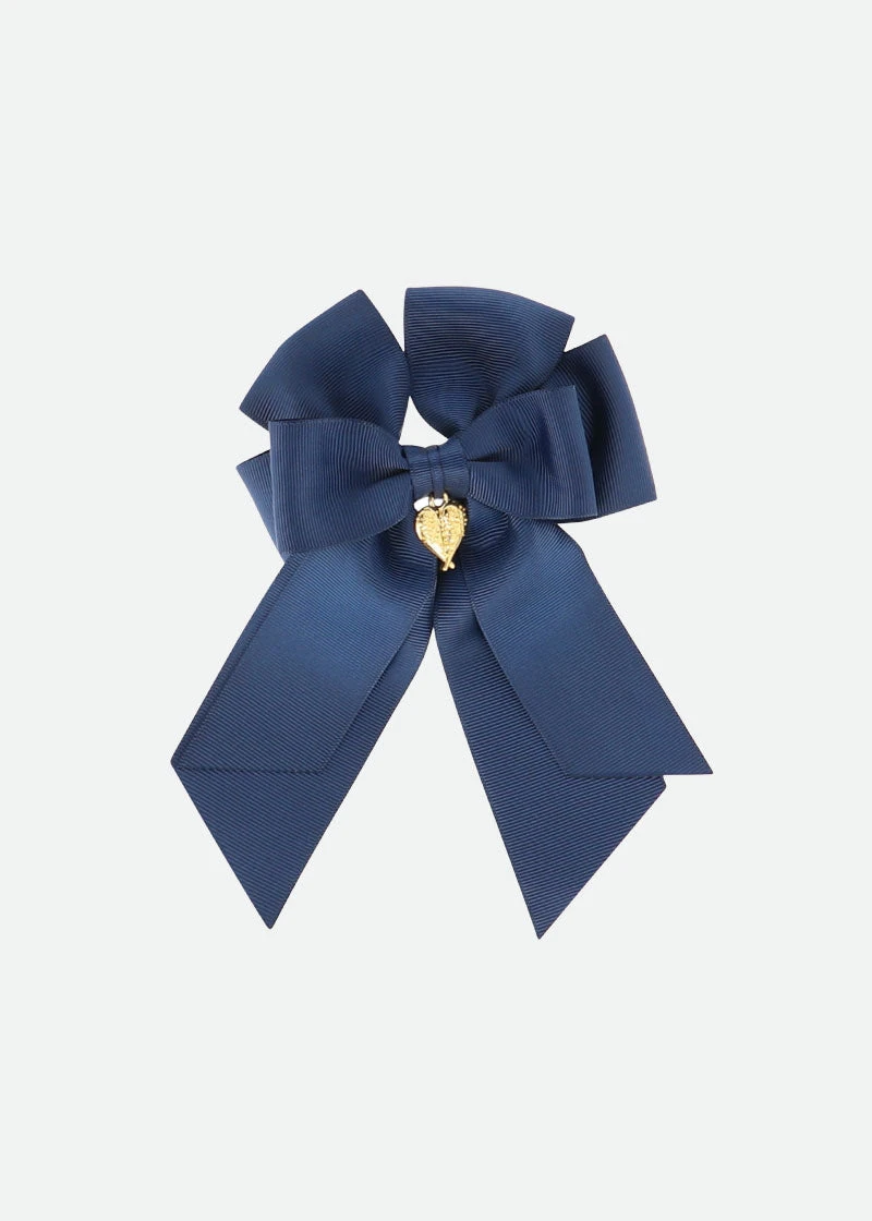 Stylish barrette bow hair clip for girls in navy blue. Bow is made from a soft polyester grosgrain, complete with our signature Angel’s Face heart charm in the centre.