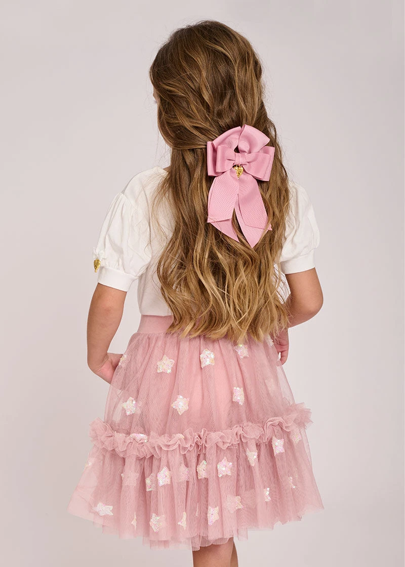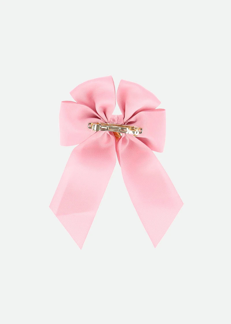 Stylish barrette bow hair clip for girls in pink. Bow is made from a soft polyester grosgrain, complete with our signature Angel’s Face heart charm in the centre.