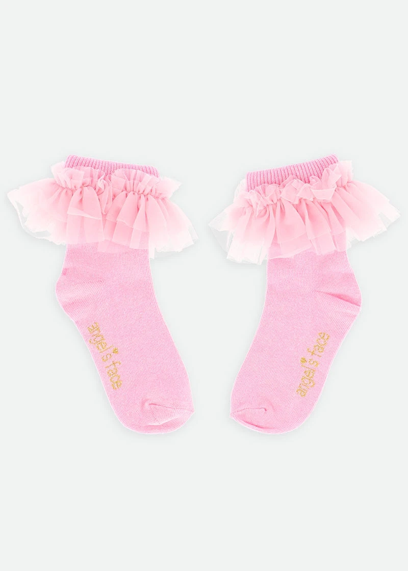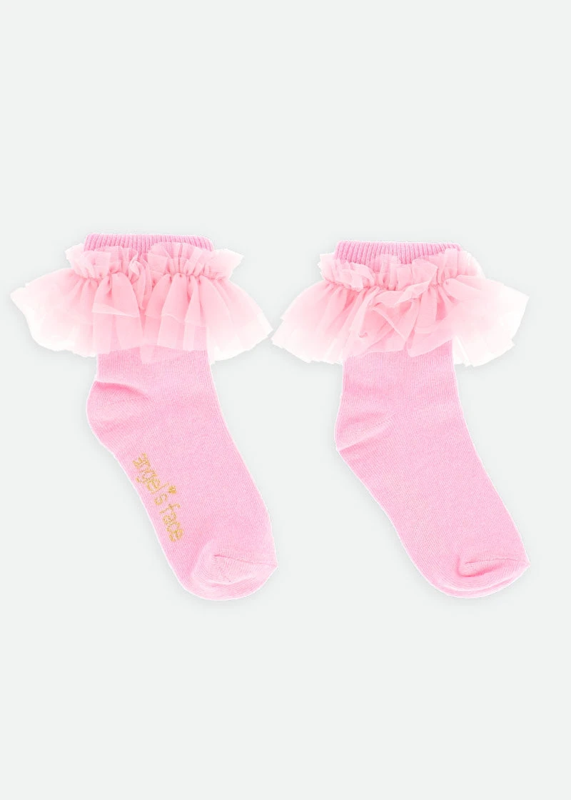 Complete your Angel’s look with our pink tulle frill socks. These socks are to be worn rolled over sitting pretty on the ankle. Socks feature Angel’s Face logo on the sole.