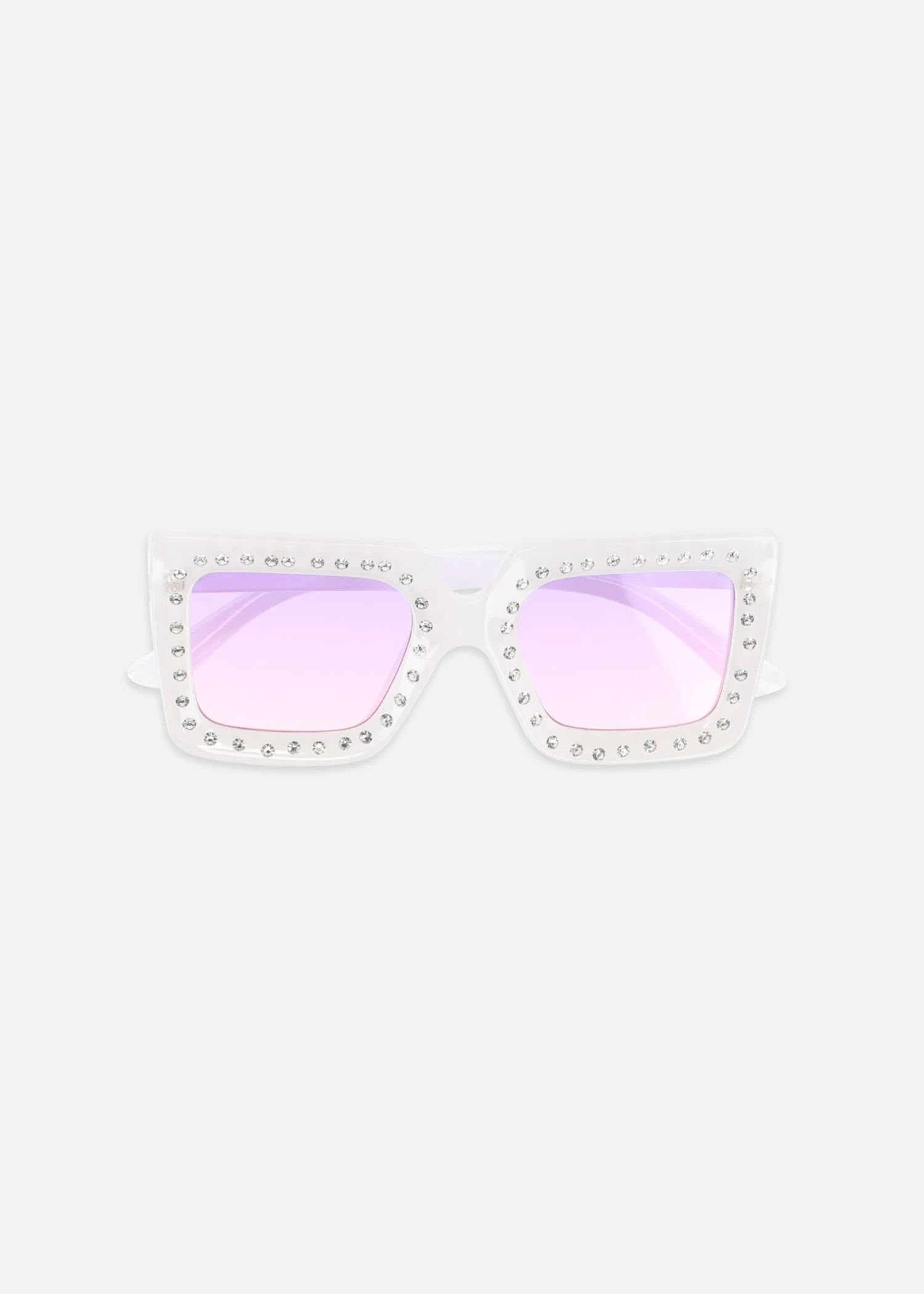 Stylish white ‘Elton John Inspired’ sunglasses with diamanté detailing for girls. These fabulous frames have our Angel’s Face logo on the side, each pair comes in a luxurious pink case. Sunglasses have full UV protection to protect delicate little eyes.