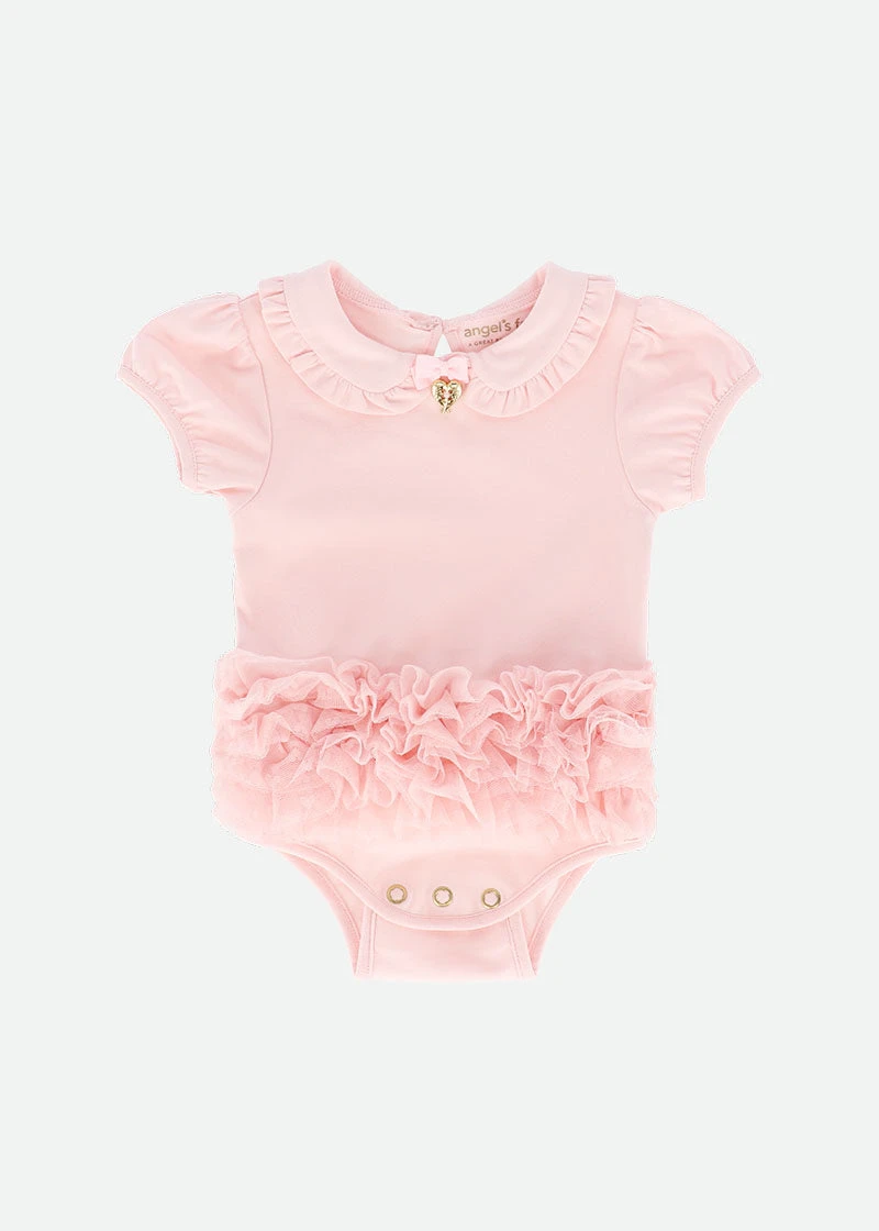 Beautiful pink baby grow with short capped sleeves and cute ruffles, made from the softest cotton. Our signature bow sits in the centre of the peter pan collar, fastening with a button at the back and comfortable poppers at the crotch.