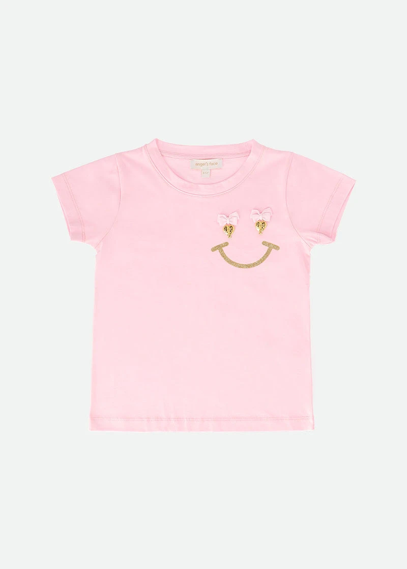 Playful summer t-shirt in fairy pink with a sparkling glitter smile and eyes made from our signature bow and gold heart charms. T-shirt is made from 100% cotton with a soft hand feel, designed with a casual easy fit.
