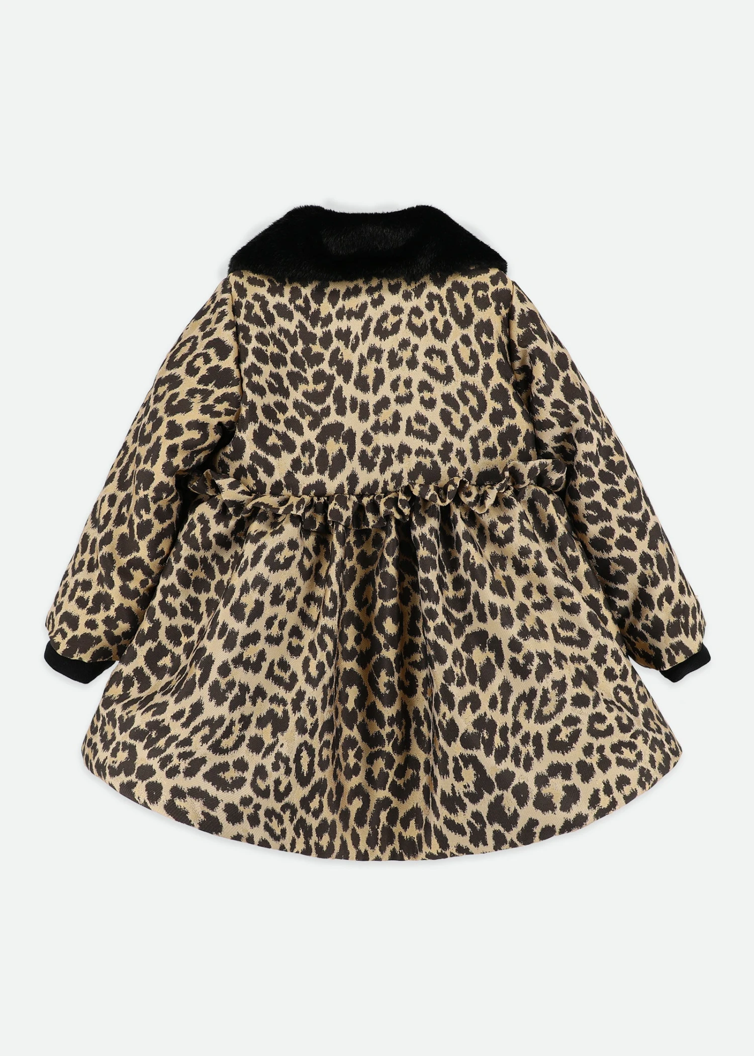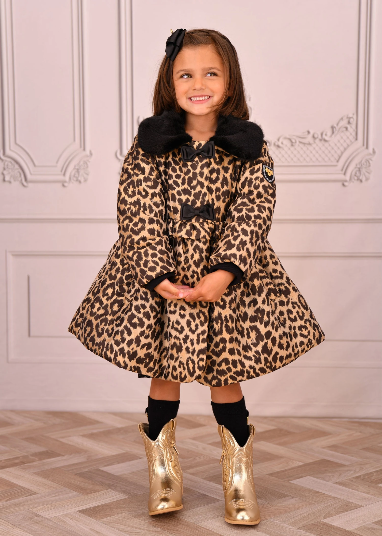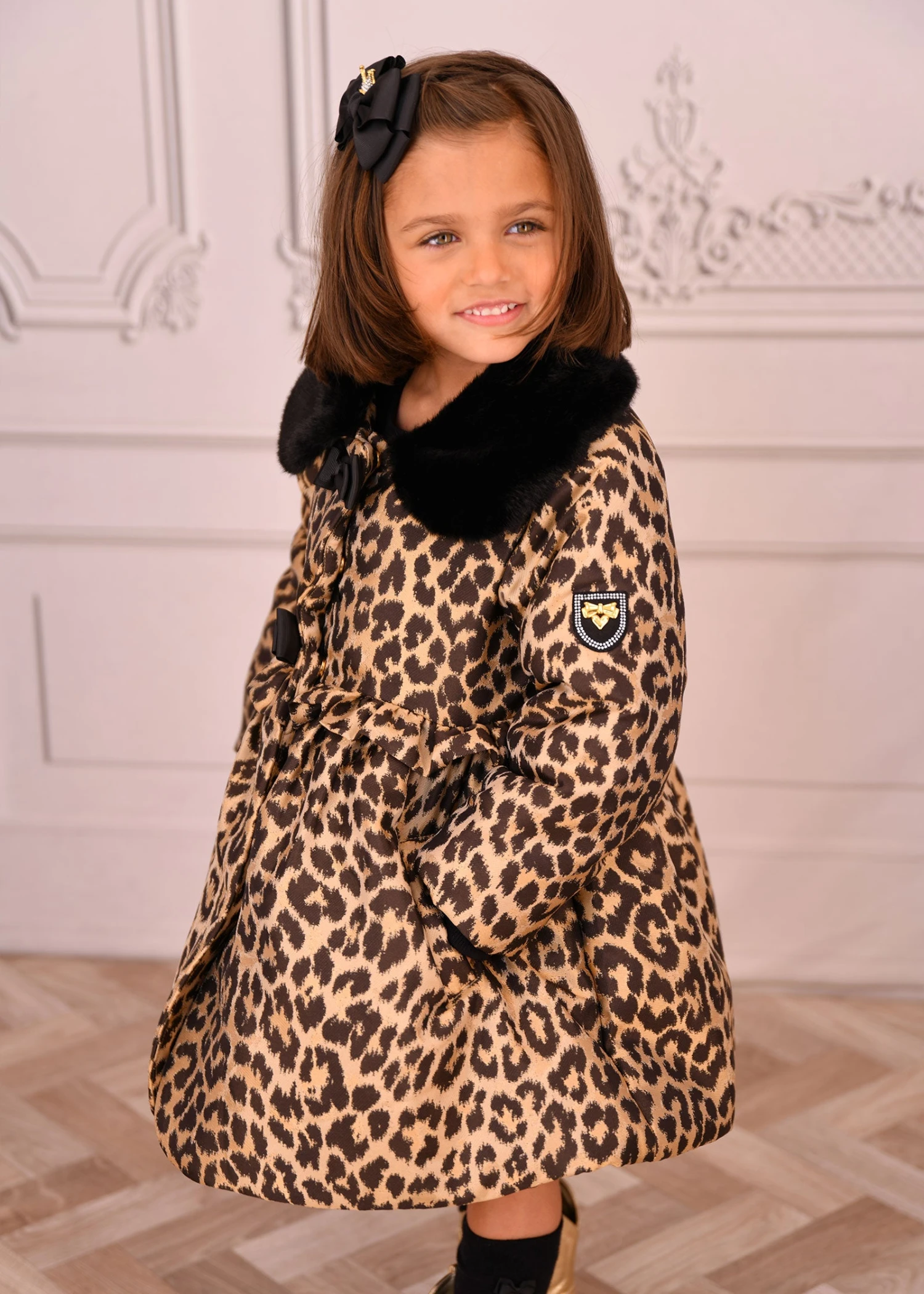 A stunning statement coat for girls, designed in a leopard jacquard. This elegant piece is trimmed with a plush faux fur collar in soft black and features pretty grosgrain bows down the front for a charming finish. Fully lined for warmth and comfort, it has gathered detailing at the waist to create a lovely flared silhouette. Perfect for layering over party dresses and special occasion outfits.