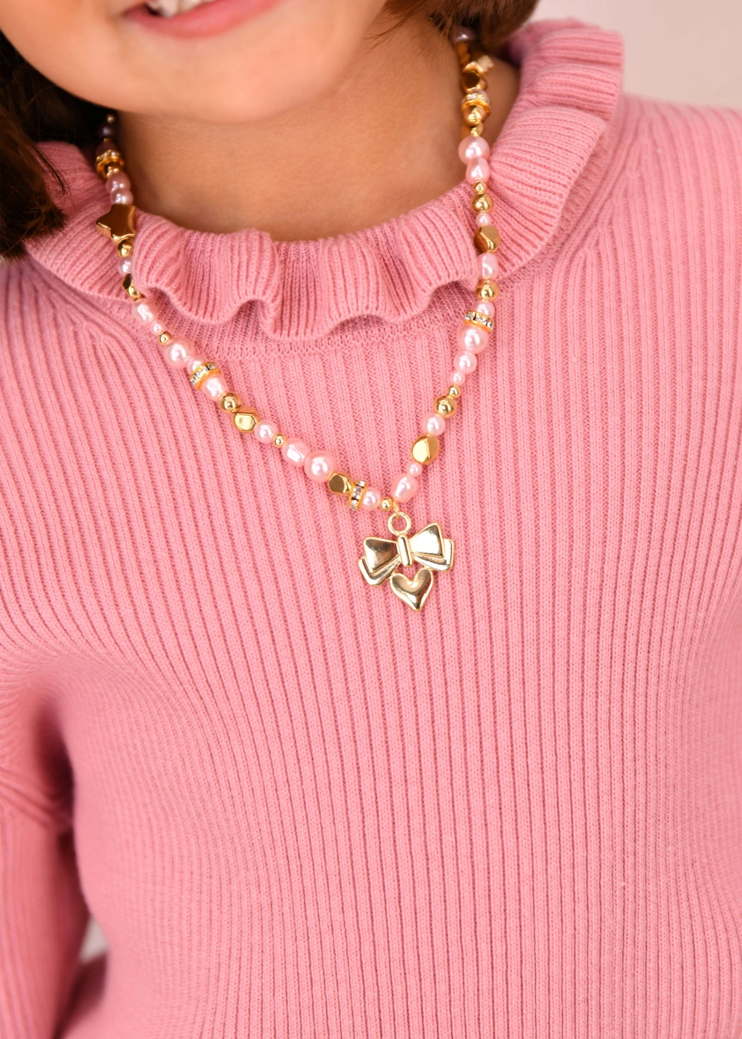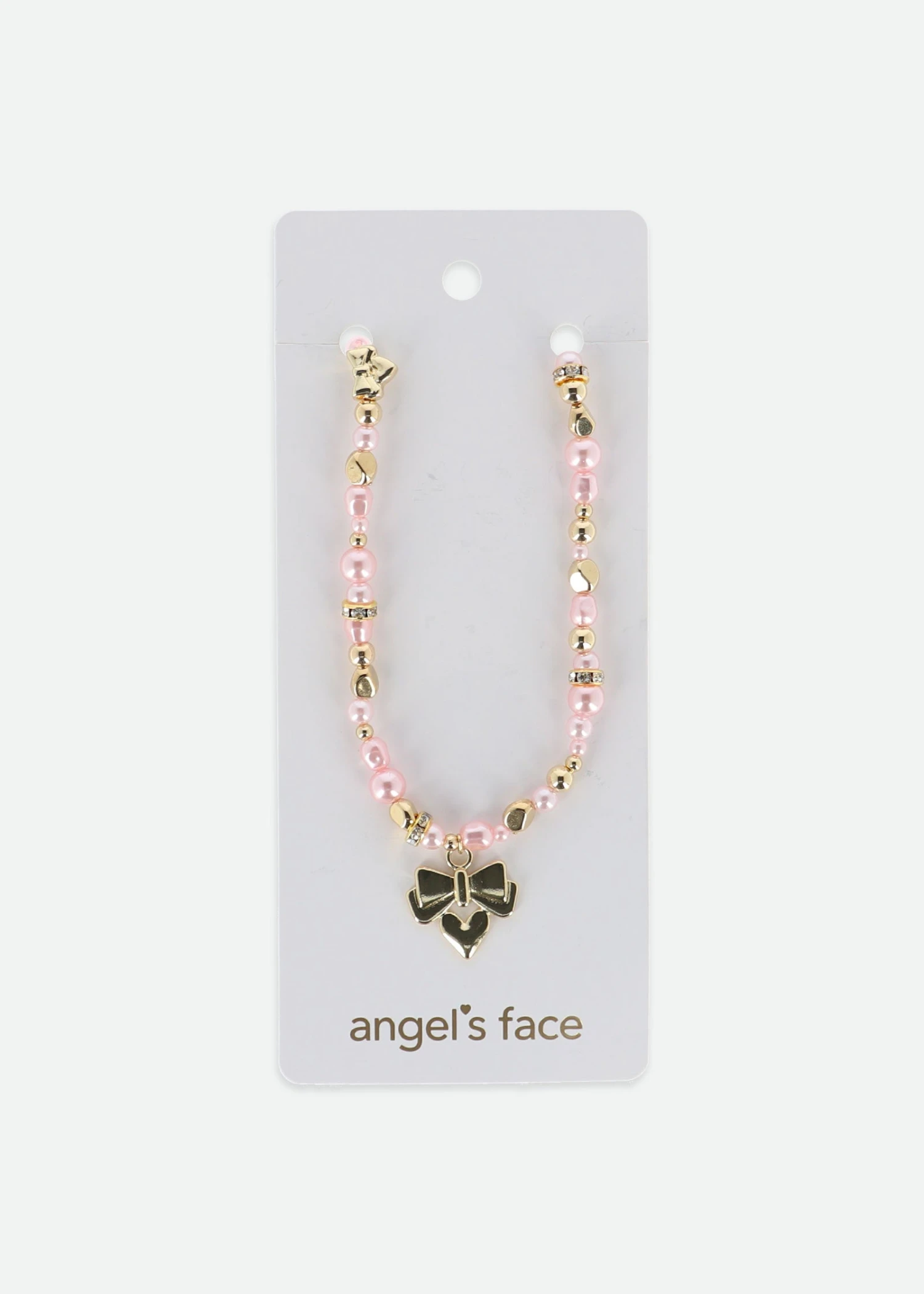 Girls pink pearl beaded necklace with cute gold Angel’s Face charms. Designed in our white pearlised pearls, fastening at the back with a simple lobster clasp, perfect for little fingers.