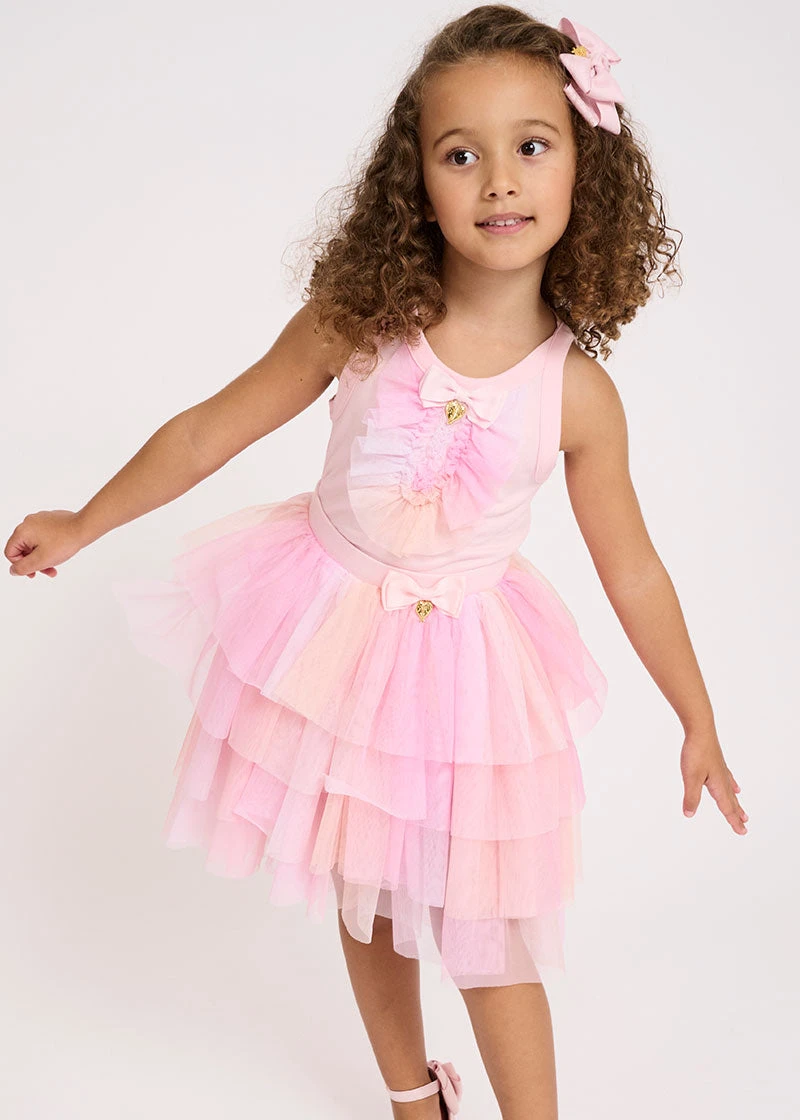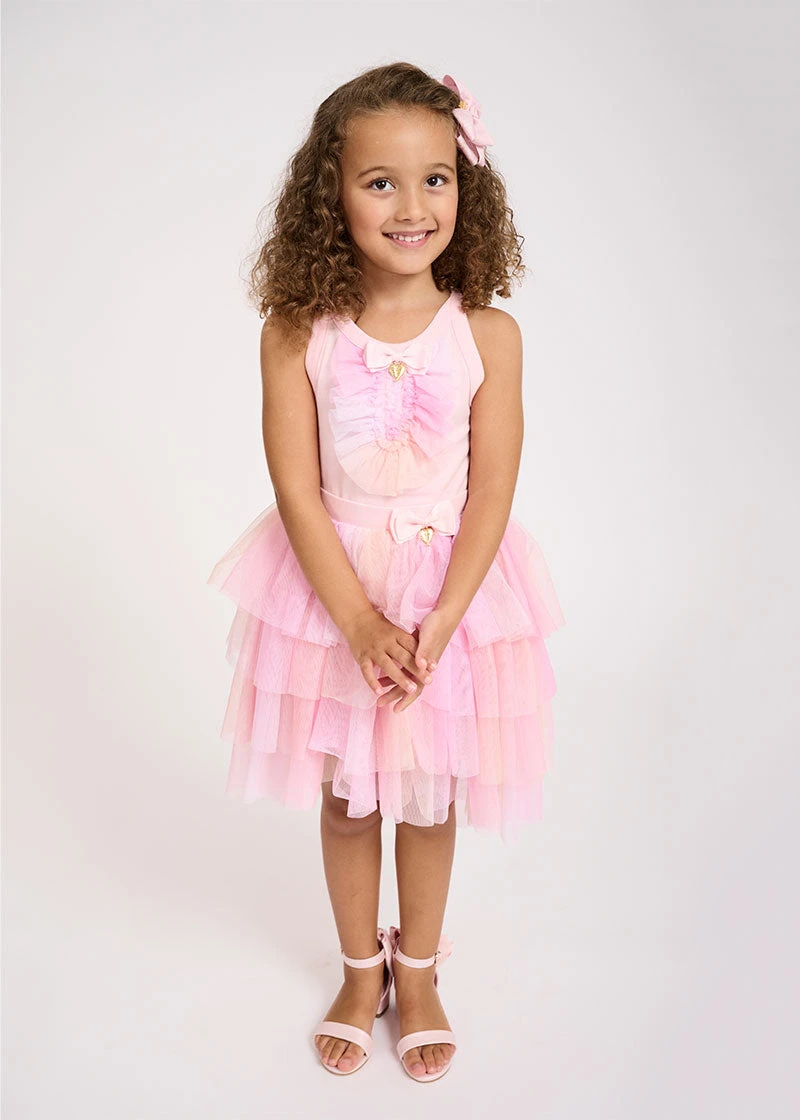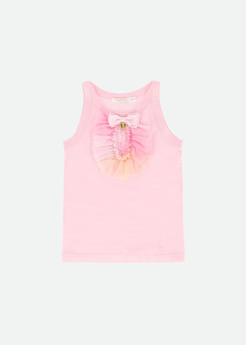 Pretty and playful summer top in fairy pink. Detailed with a fabulous ruffle tulle bib on the front bodice featuring our signature bow and gold heart charm centre of the neckline. This cute top is smooth against the skin made in our softest cotton blend. Easy pull on fit.