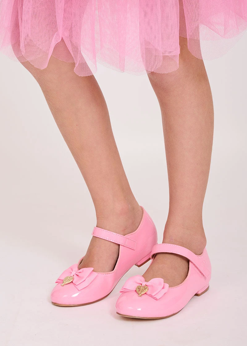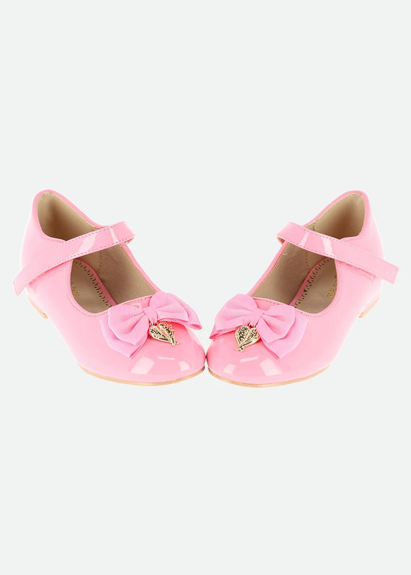 Perfect pumps for party girls in rose pink. The glossy patent shoe designed in a classic shape features our signature bow and gold heart charm on the front. Shoe fastens with velcro strap for quick changes complete with a non-slip rubber soles.