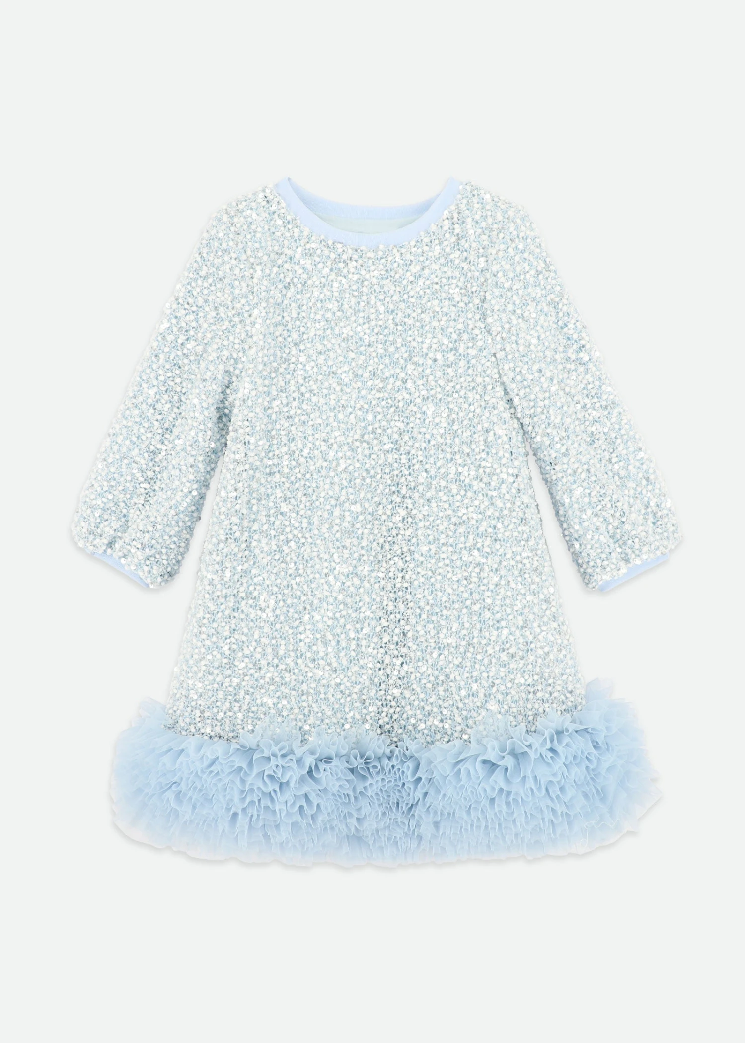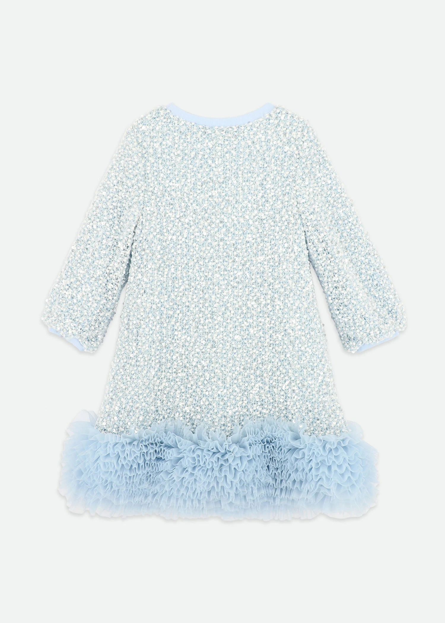 Make an entrance in this dazzling sequin dress for girls. Covered all over in shimmering blue sequins, this elegant dress features long sleeves and a voluminous soft tulle hem for extra drama and twirl. A small grosgrain bow with our signature gold heart charm decorates the side, adding a sweet finishing touch. Fully lined in soft cotton for comfort against the skin, this show-stopping piece is perfect for parties and special occasions.