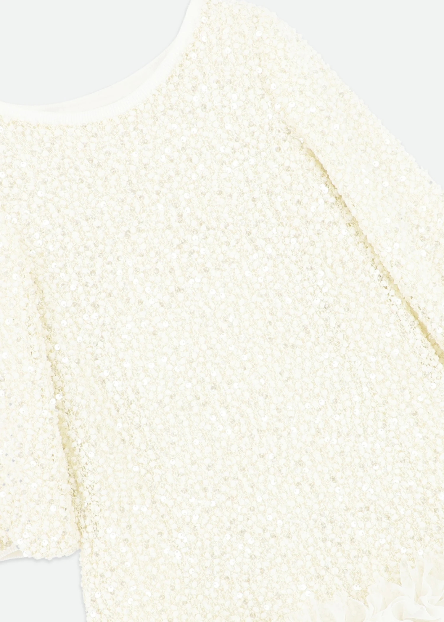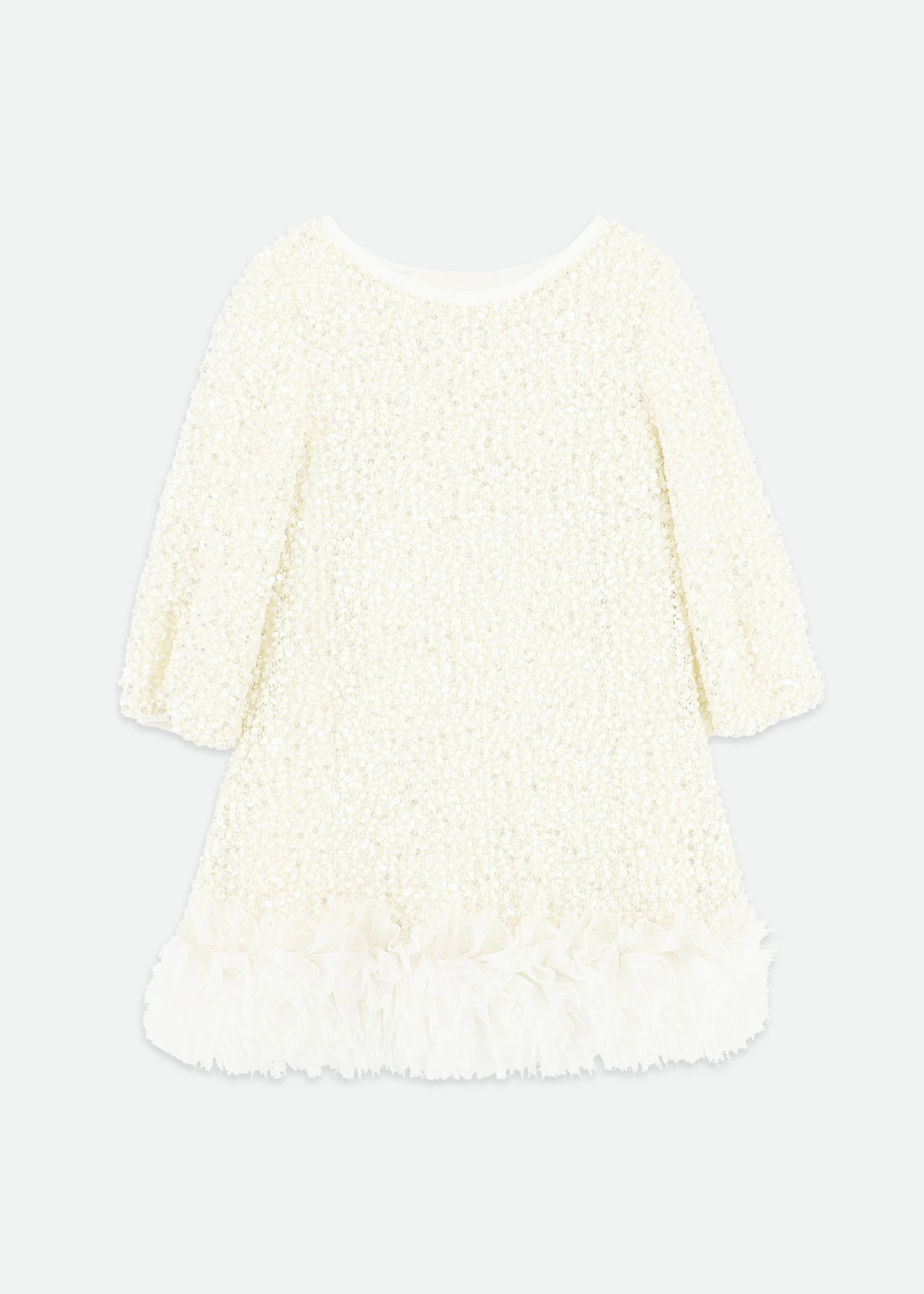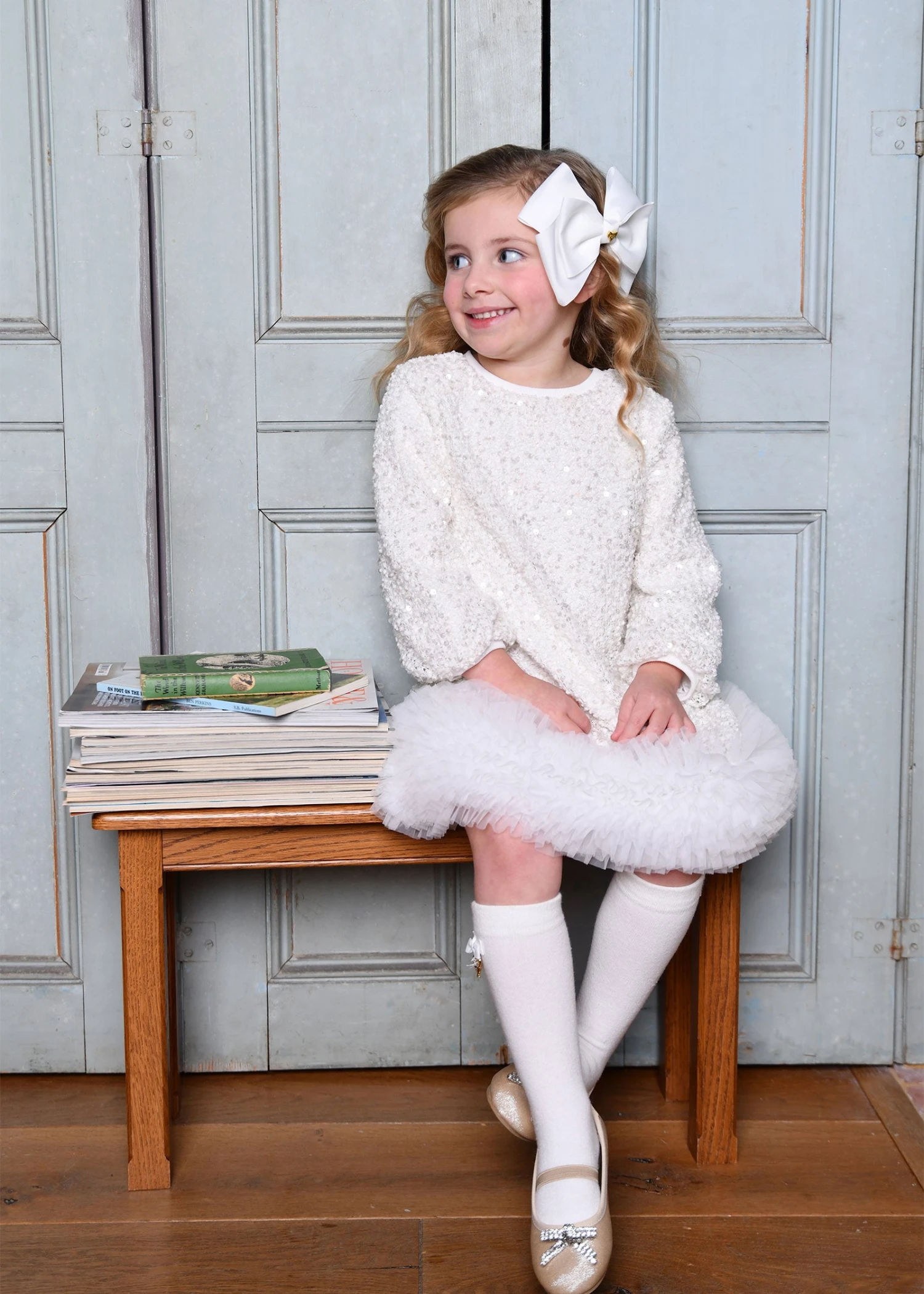 Make an entrance in this dazzling sequin dress for girls. Covered all over in shimmering white sequins, this elegant dress features long sleeves and a voluminous soft tulle hem for extra drama and twirl. A small grosgrain bow with our signature gold heart charm decorates the side, adding a sweet finishing touch. Fully lined in soft cotton for comfort against the skin, this show-stopping piece is perfect for parties and special occasions.