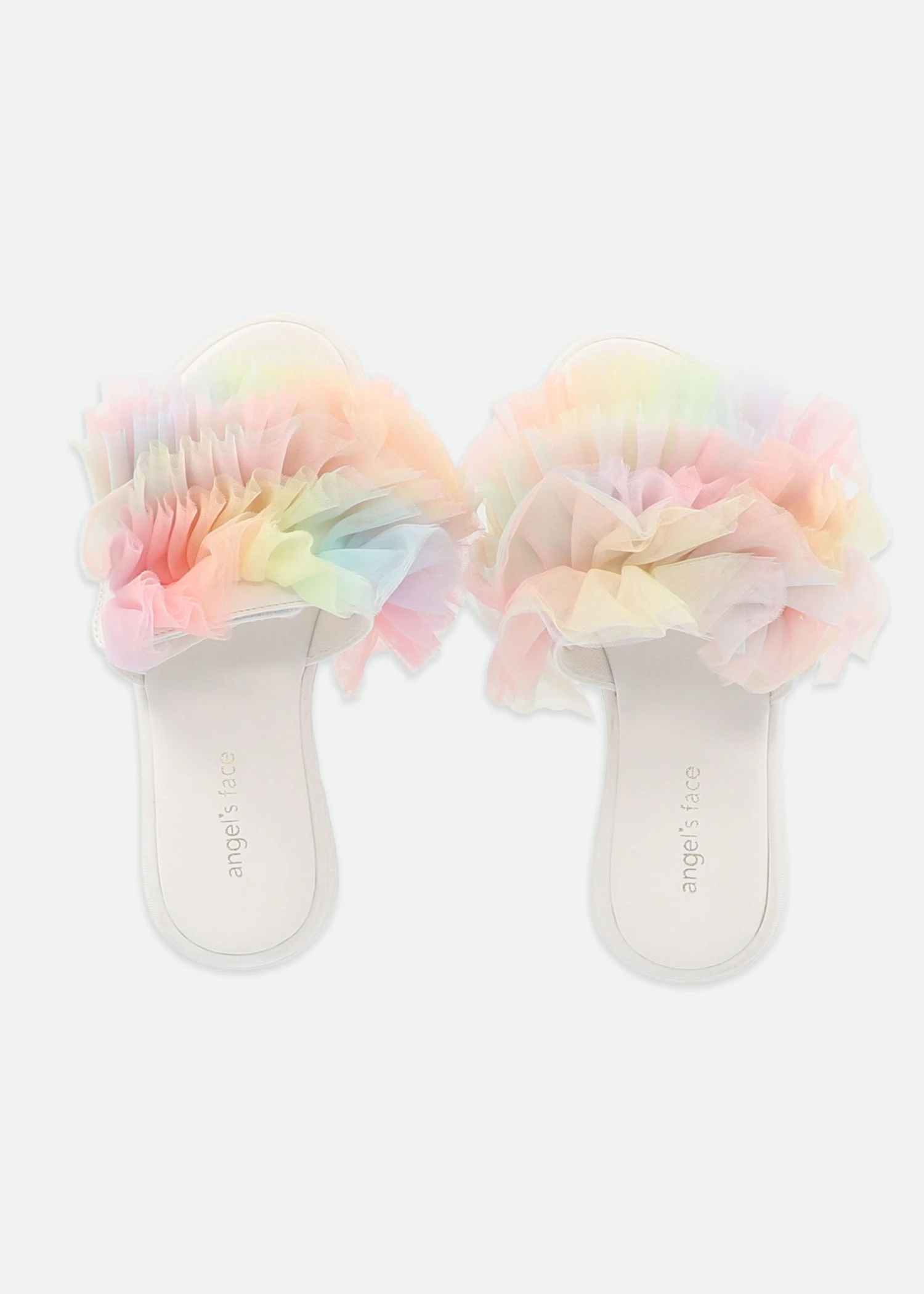 Stunning white slider with rainbow tulle ruffle detail. This slider has a velcro strap for easy wear. Features chunky rubber soles for extra grip and a soft cushioned interior adding comfort.