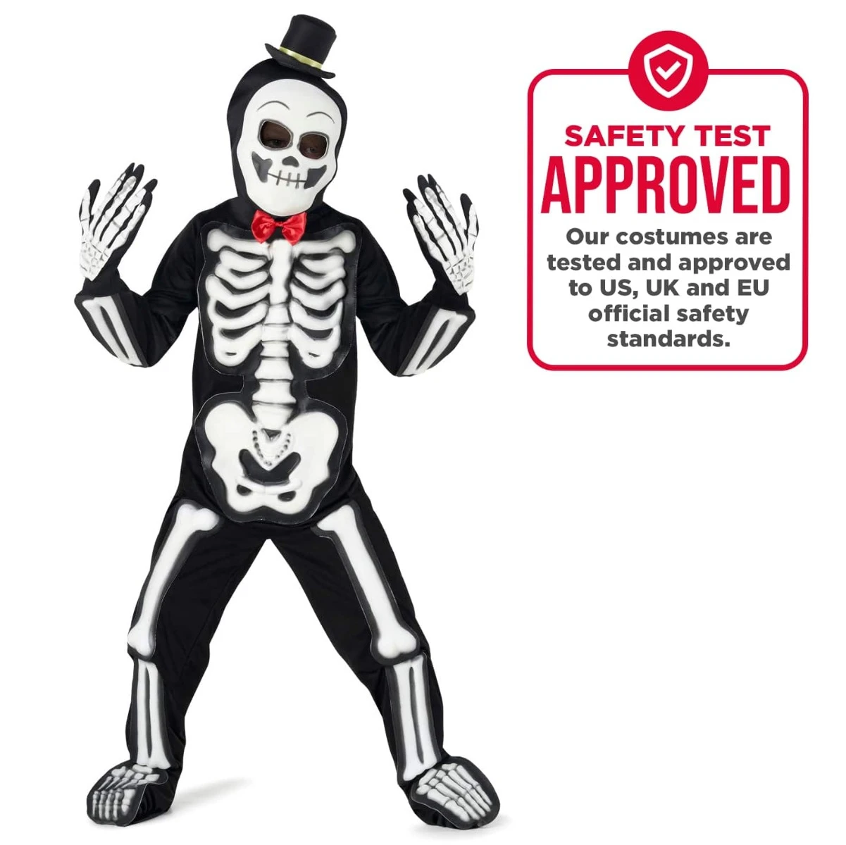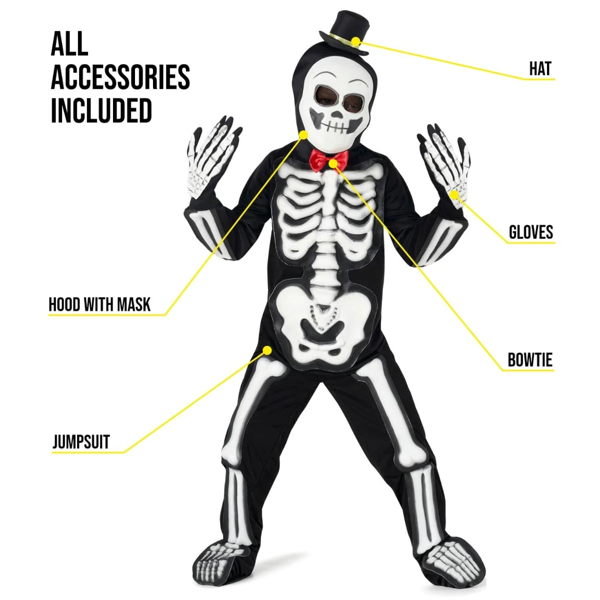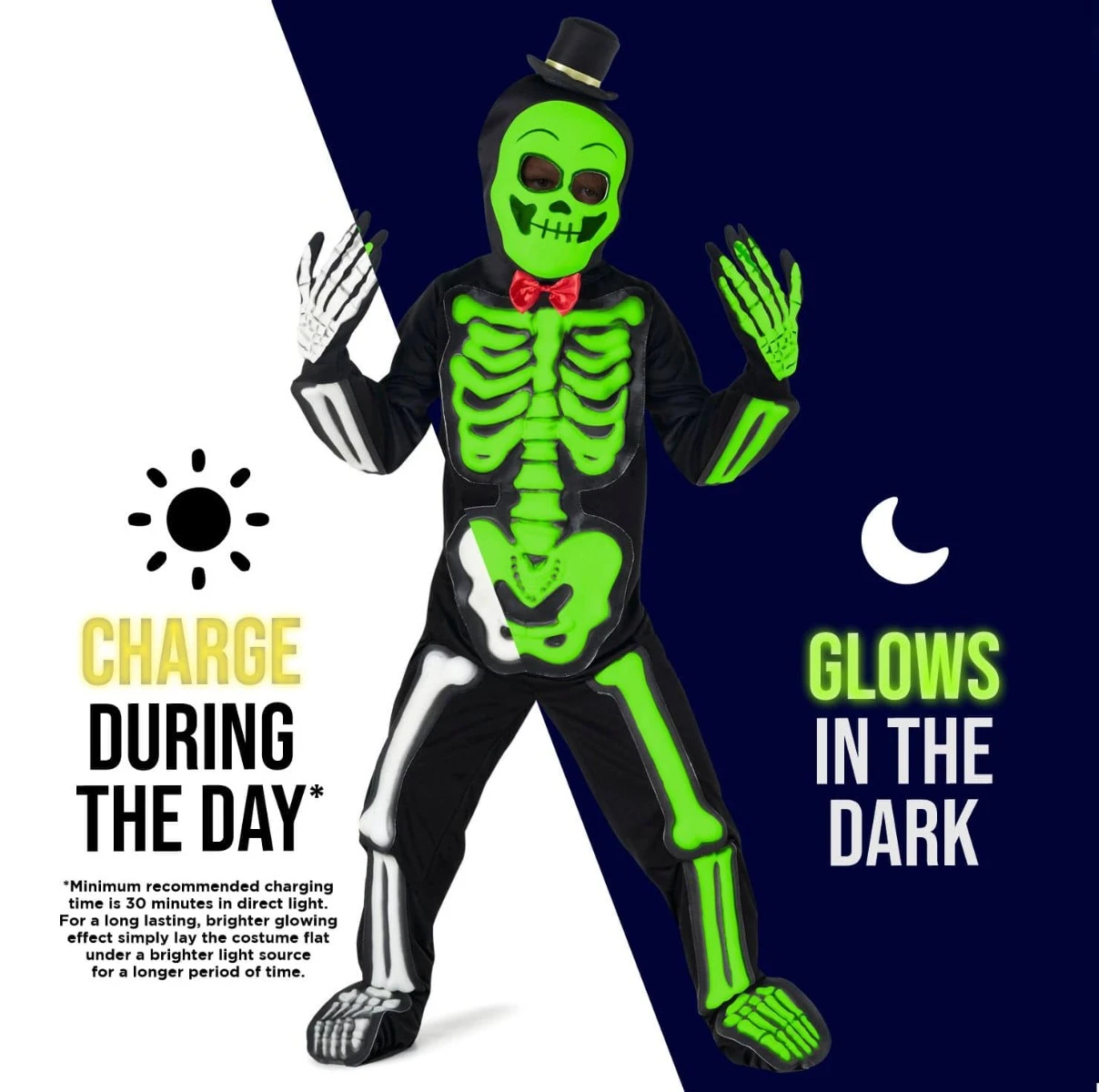 Als je botten niet gloeien, zeg dan gewoon nee. Nu kan je kind een skelet zijn dat oplicht in het donker met dit ongelooflijk coole skelettenkostuum voor kinderen. Ontworpen om je ribbenkast te kietelen en je ook de stuipen op het lijf te jagen, is dit kostuum van topkwaliteit een klasse apart. Dit kostuum bevat het masker en de handschoenen op de foto en is perfect voor Halloween, Mexicaanse Day of the Dead vieringen en elke andere verkleed gelegenheid.