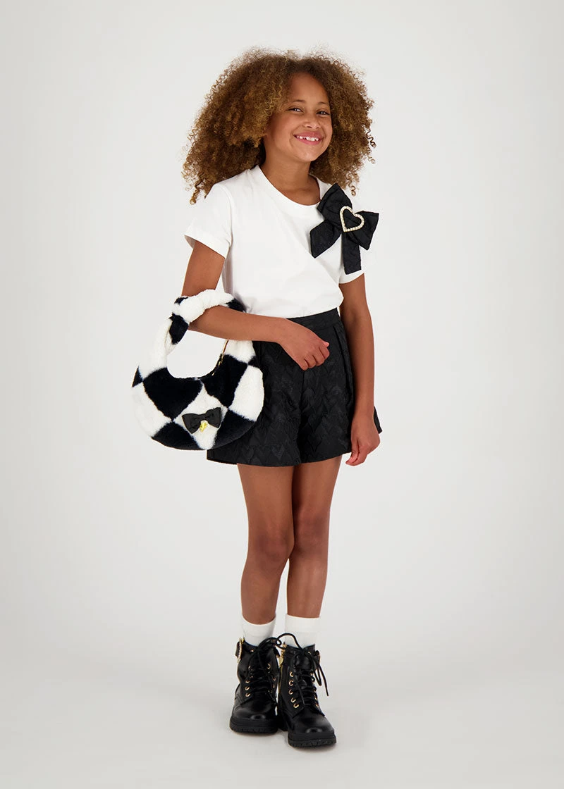 Glamorous faux fur girls black and white handbag. Luxouriosly soft diamond printed fur bag featuring a bright print satin lining. Perfect for keeping small essentials secure fastening along the top with our iconic gold zipper. Bag is complete with our signature bow and gold heart charm on the front.