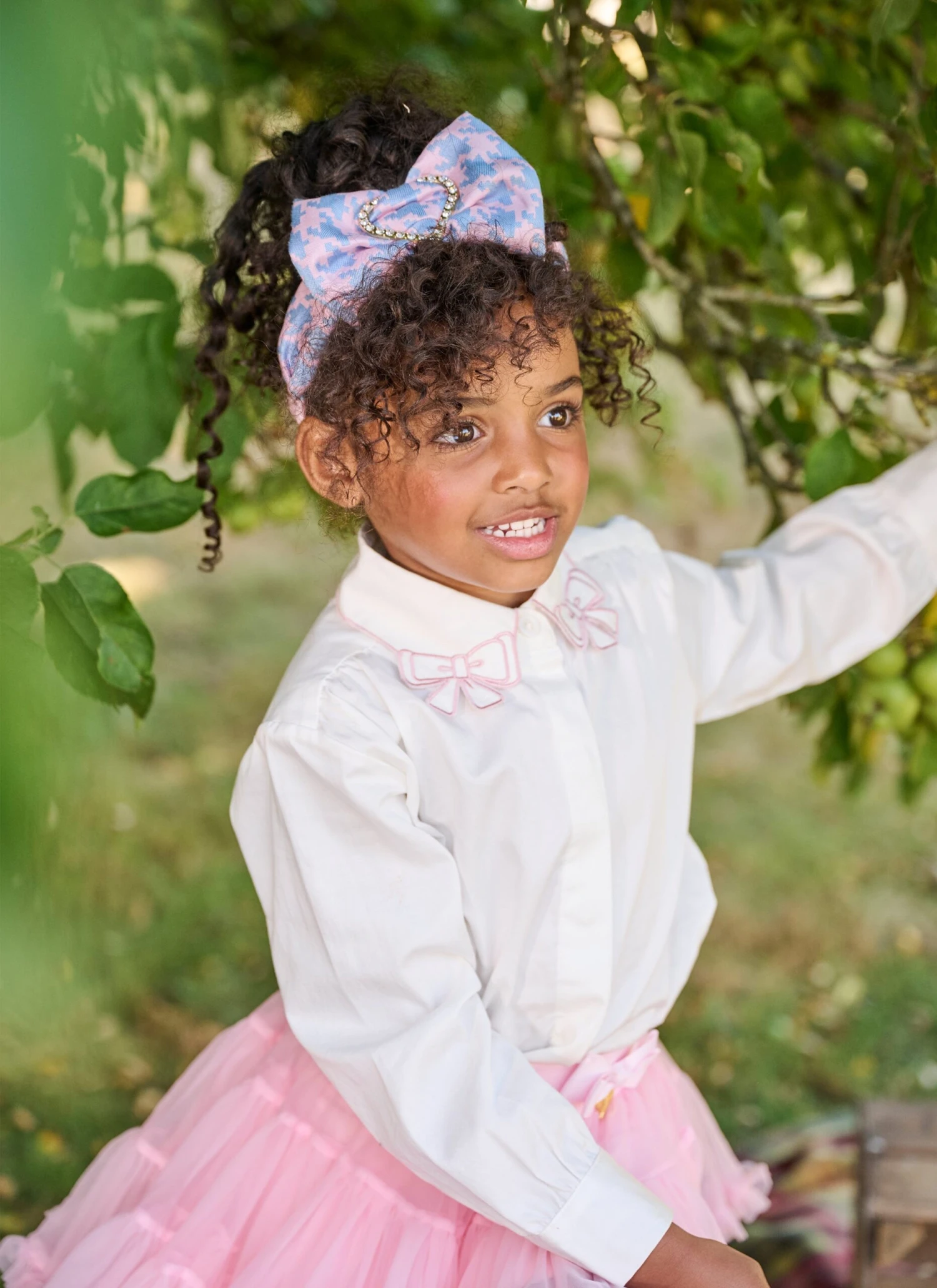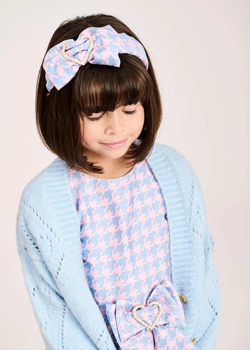 Gorgeous pink and blue houndstooth hairband made from soft polyester jacquard. The headband features a decorative bow and diamanté heart buckle.