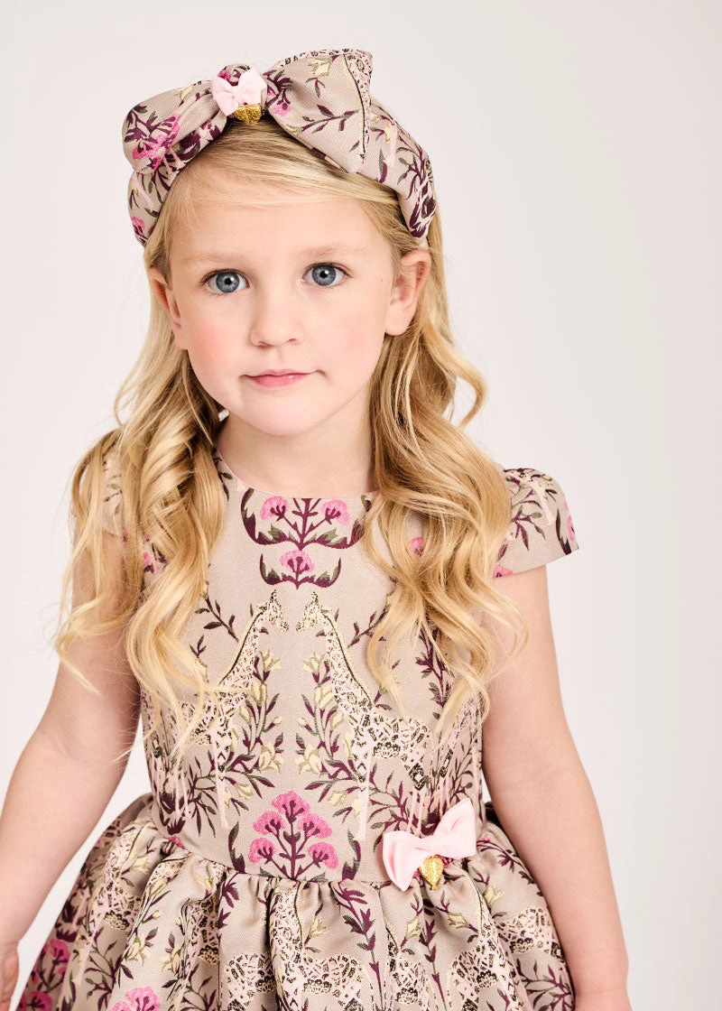 Mink and pink giraffe pattern hairband. Made from a soft polyester jacquard in a tie knot design, headband features our signature bow and gold heart charm.